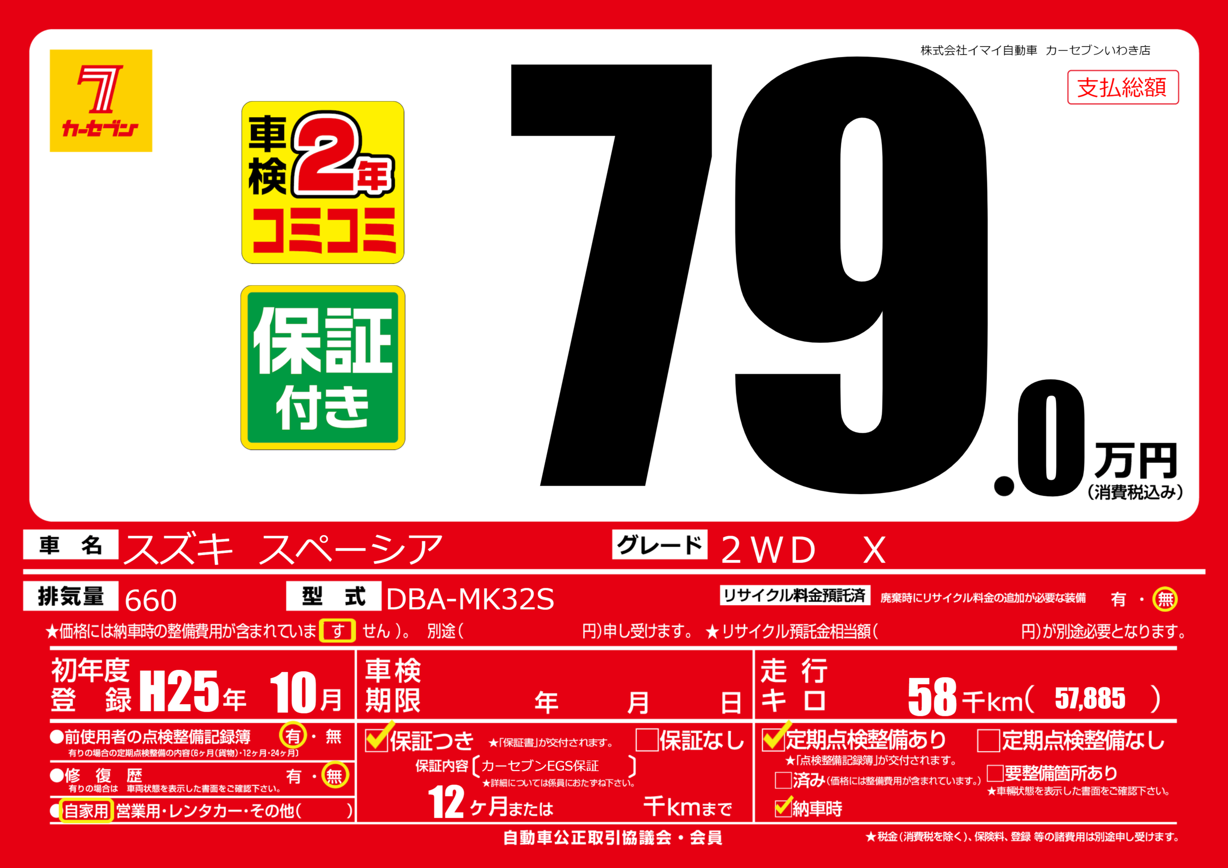 | 車名 | スズキ スペーシア | グレード ミッション 排気量 |
