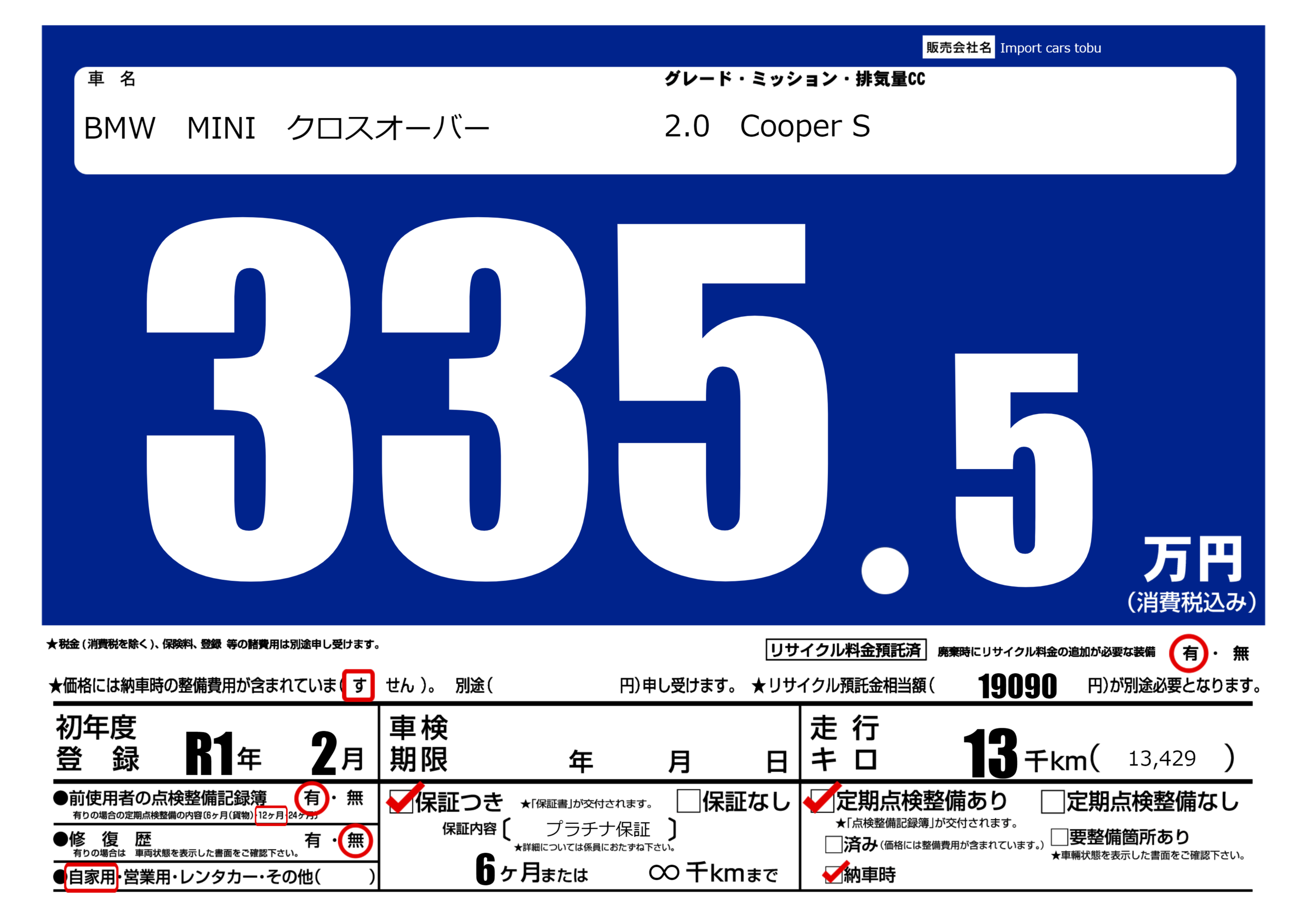 保証付き 保証内容( プラチナ保証) 6ヶ月または(∞)千kmまで |