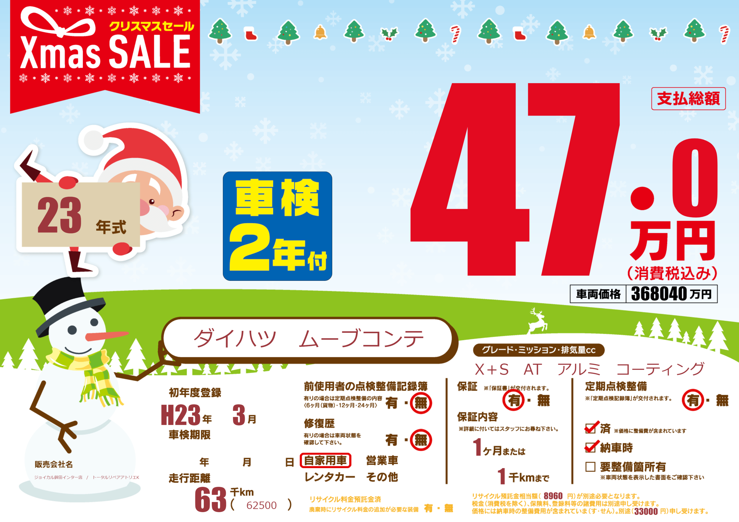 | 定期点検整備 | 定期点検整備あり 定期点検整備済み 納車時あり | ||