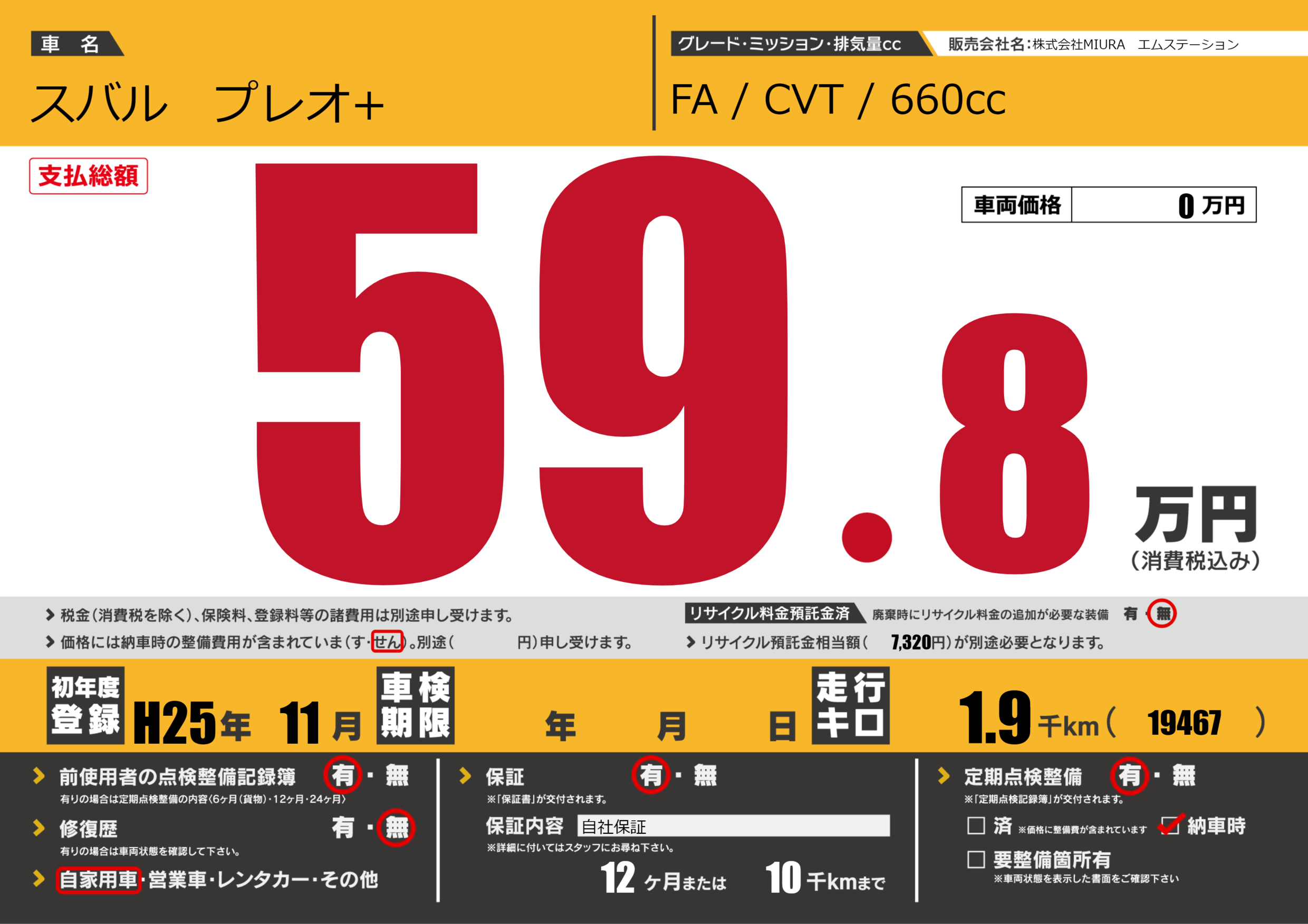 | 車名 | スバル プレオ+ | グレード ミッション 排気量 |
