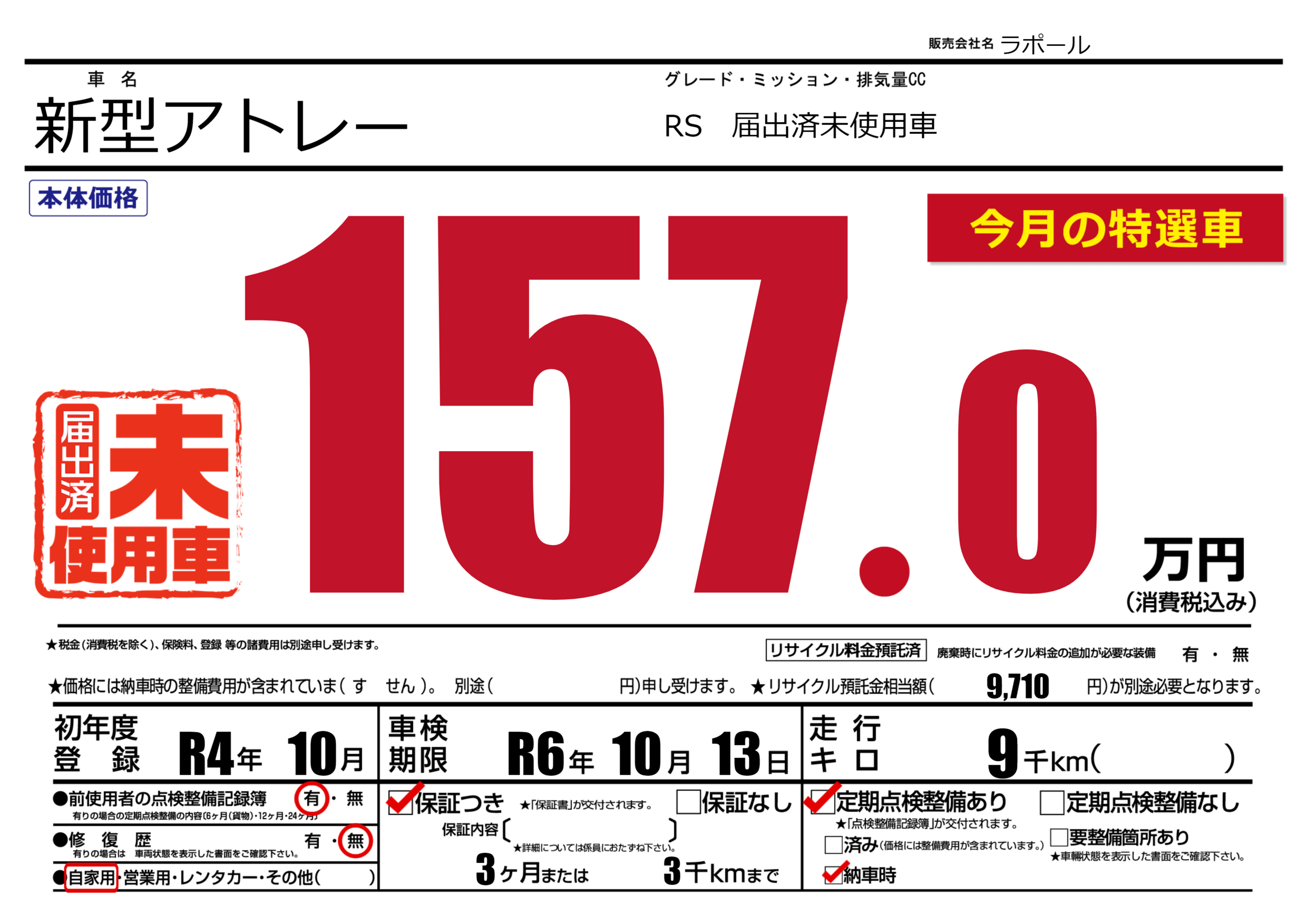 | 走行キロ | 0.9万km | 初年度登録 | R4年10月 |