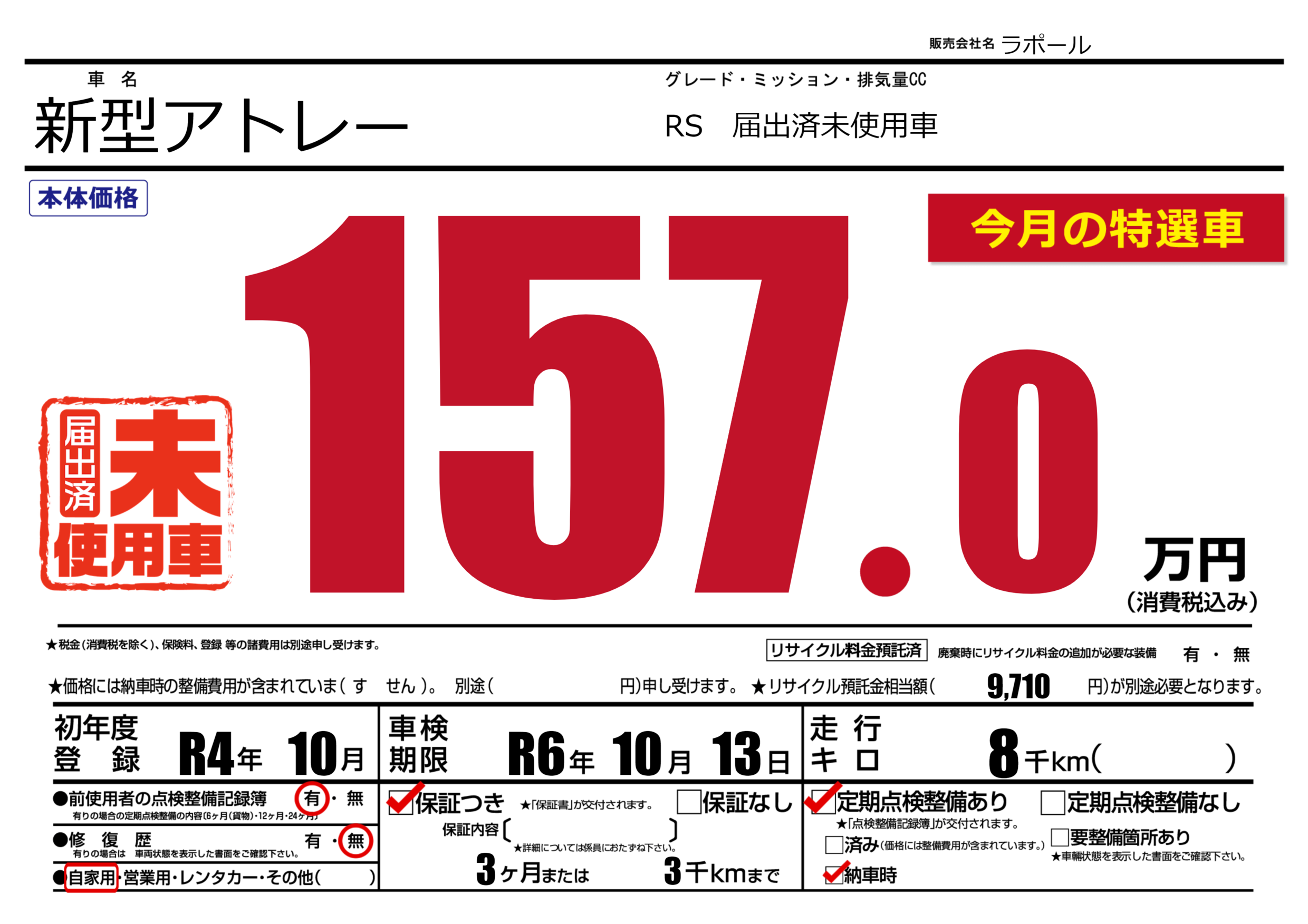 | 走行キロ | 0.8万km | 初年度登録 | R4年10月 |