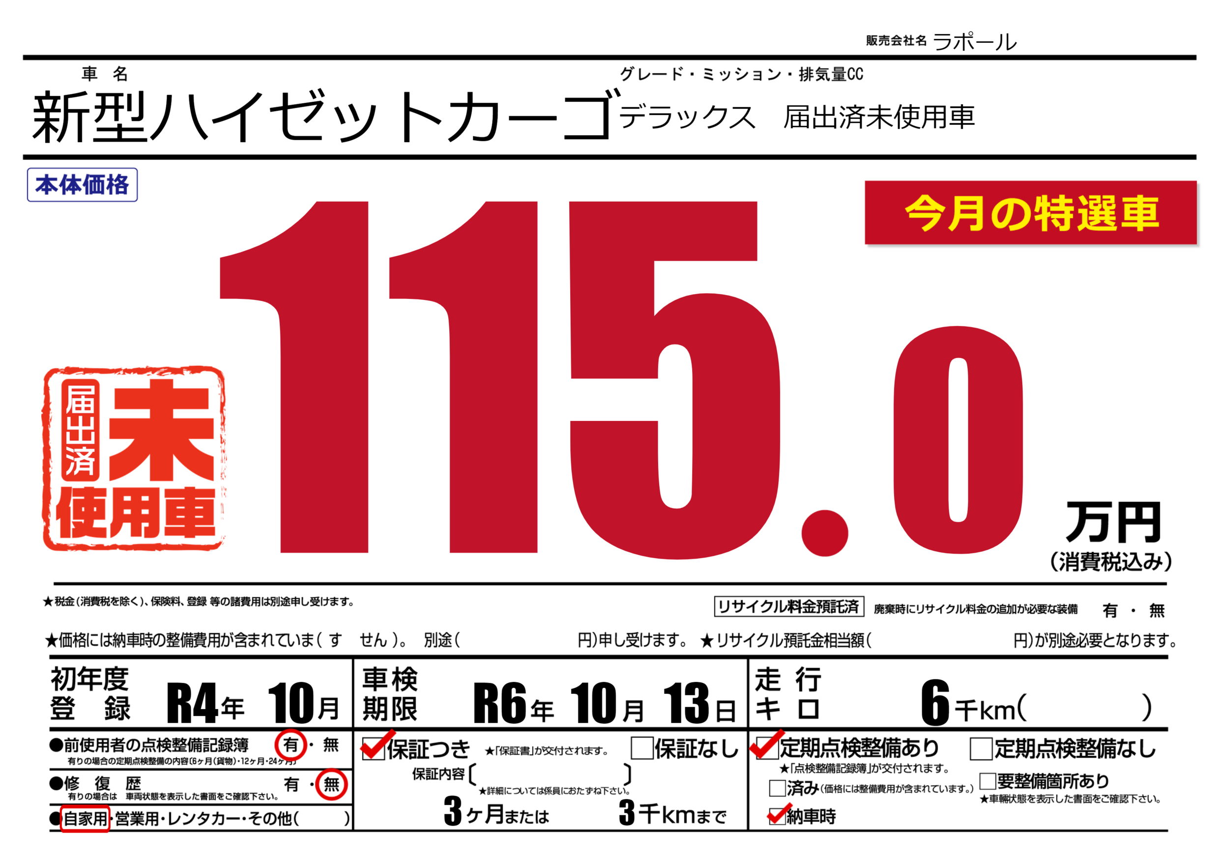 | 車名 | 新型ハイゼットカーゴ | グレード ミッション 排気量 |
