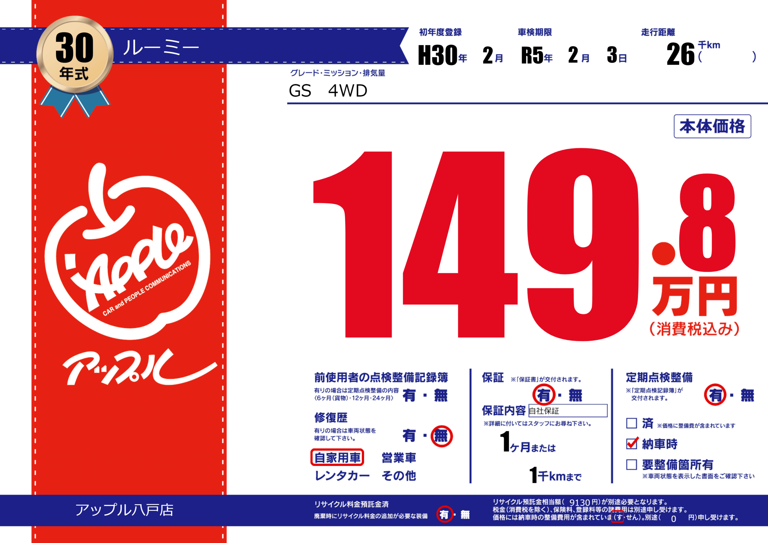 | 車名 | ルーミー | グレード ミッション 排気量 |