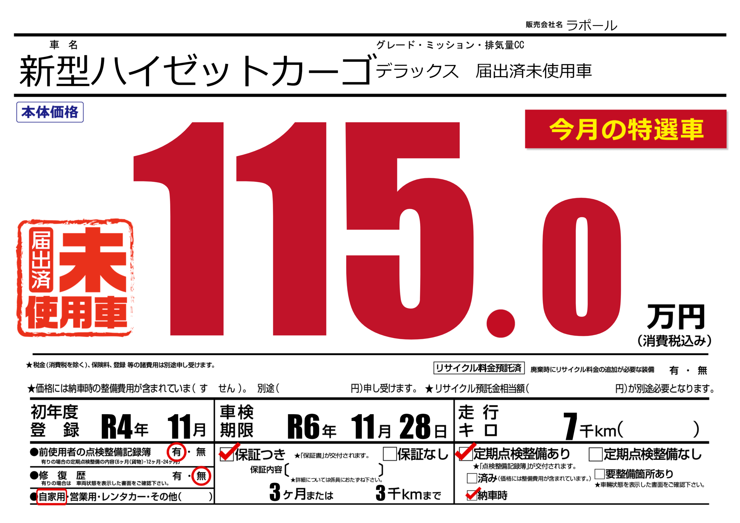 | 走行キロ | 0.7万km | 初年度登録 | R4年11月 |