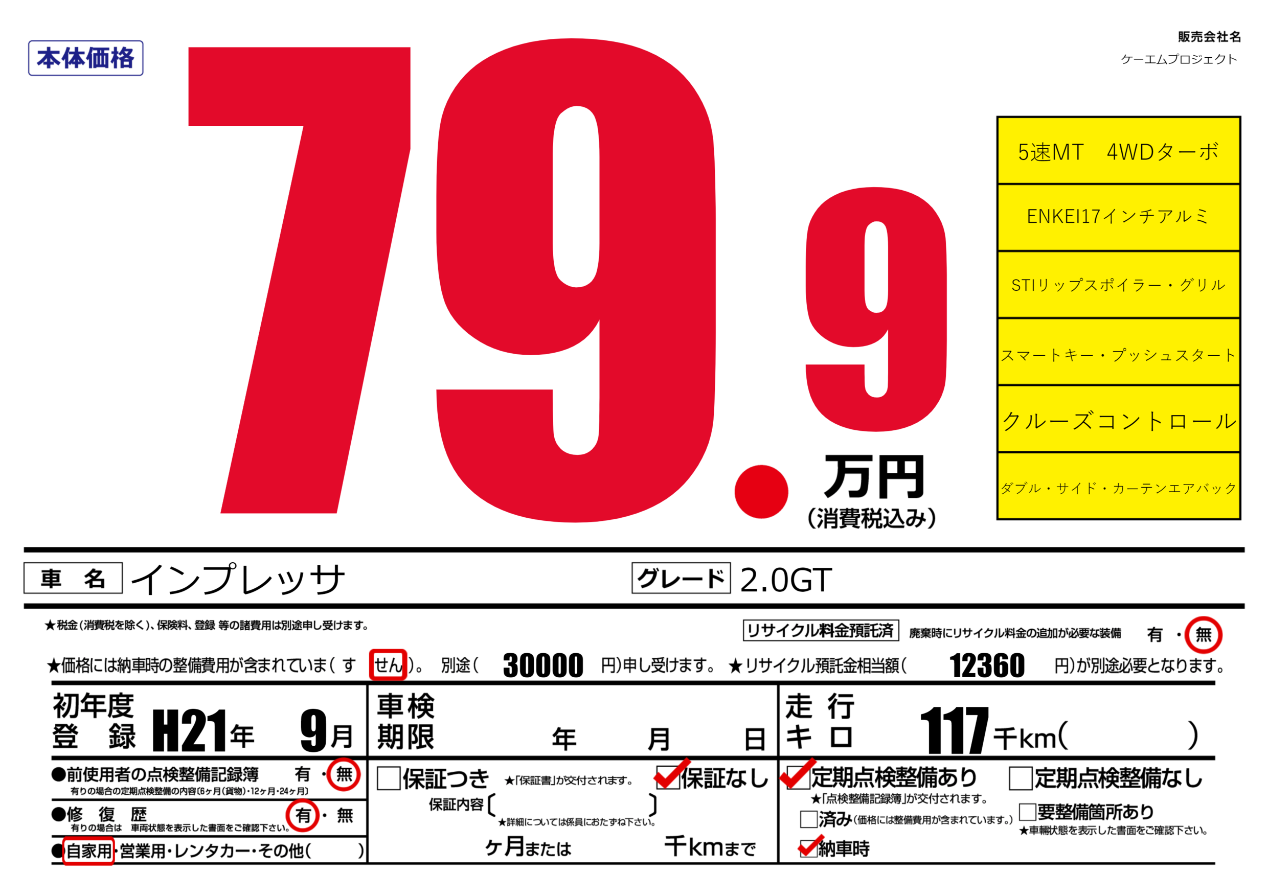 | 車名 | インプレッサ | グレード ミッション 排気量 |