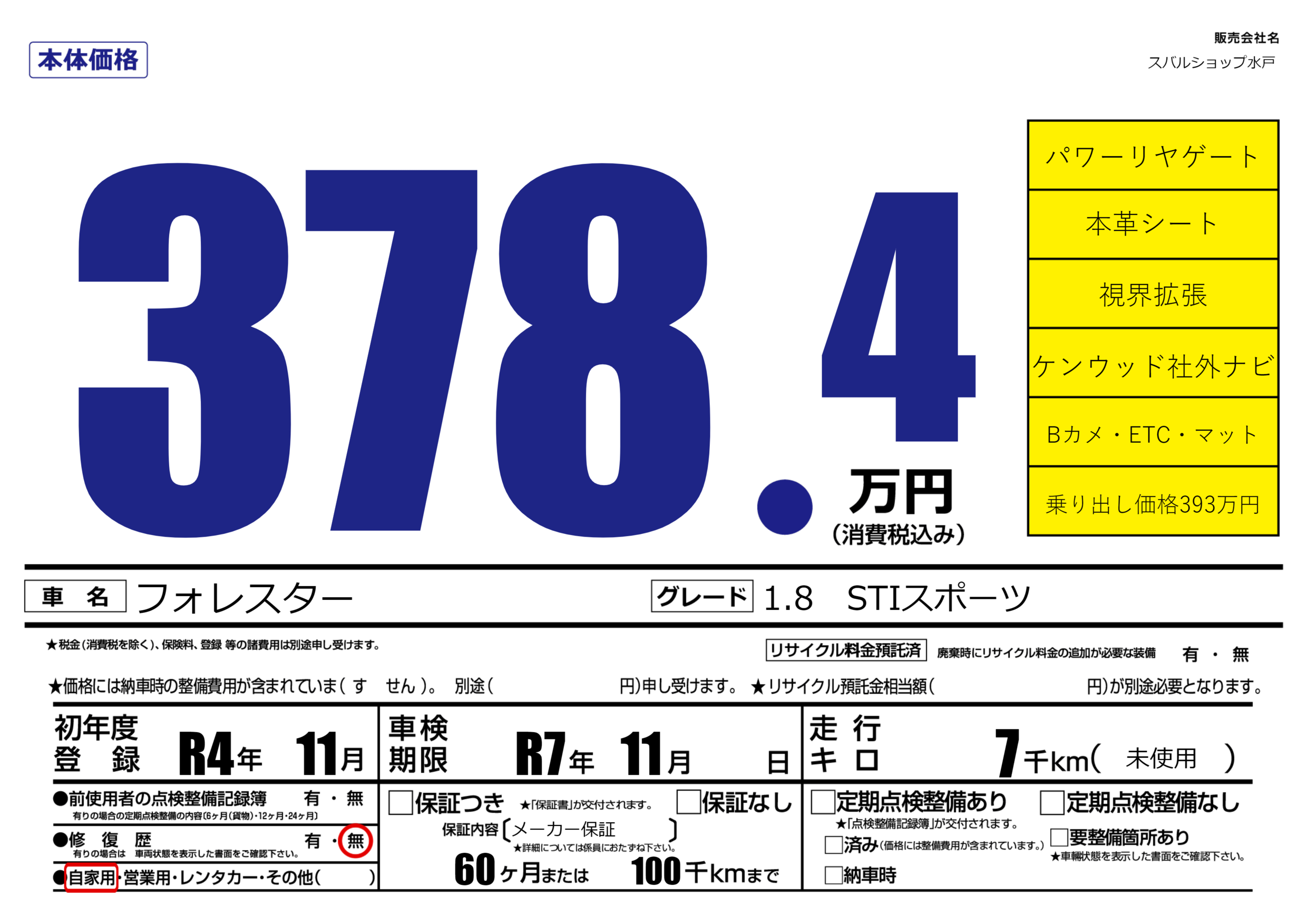 | 車名 | フォレスター | グレード ミッション 排気量 |