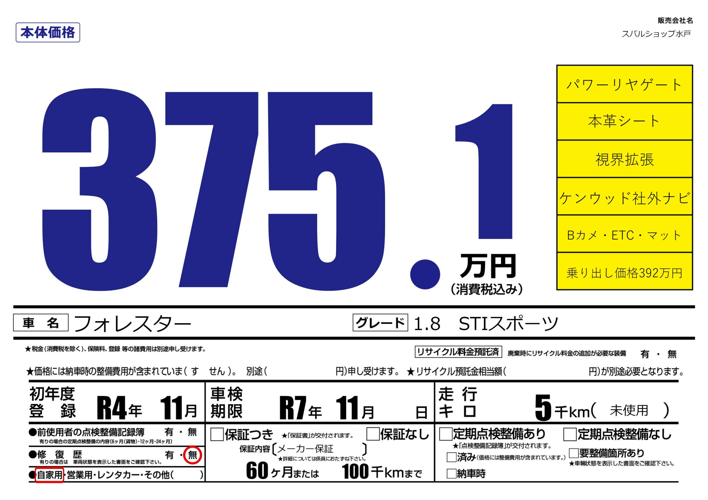 | 車名 | フォレスター | グレード ミッション 排気量 |