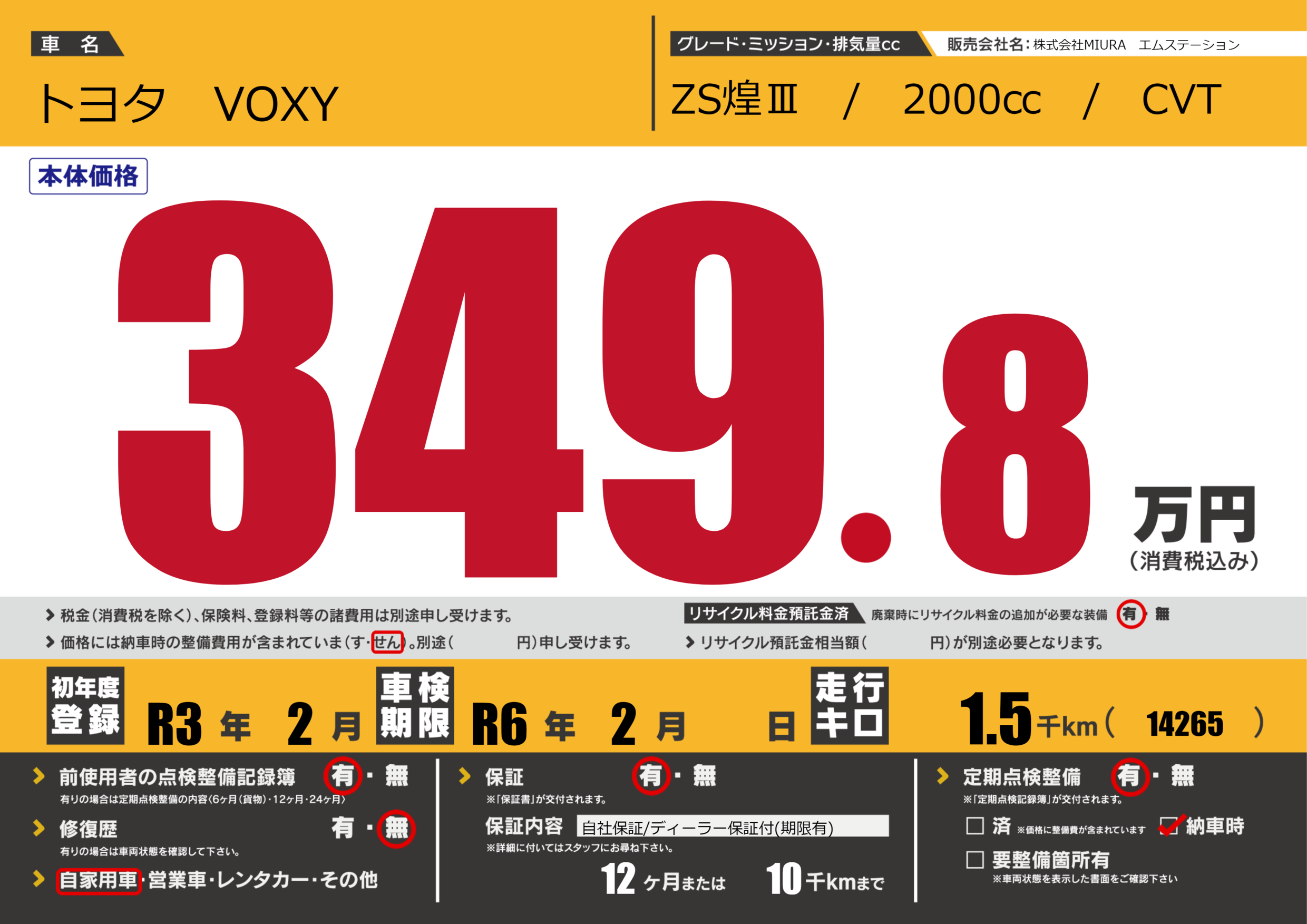 | 車名 | トヨタ VOXY | グレード ミッション 排気量 |