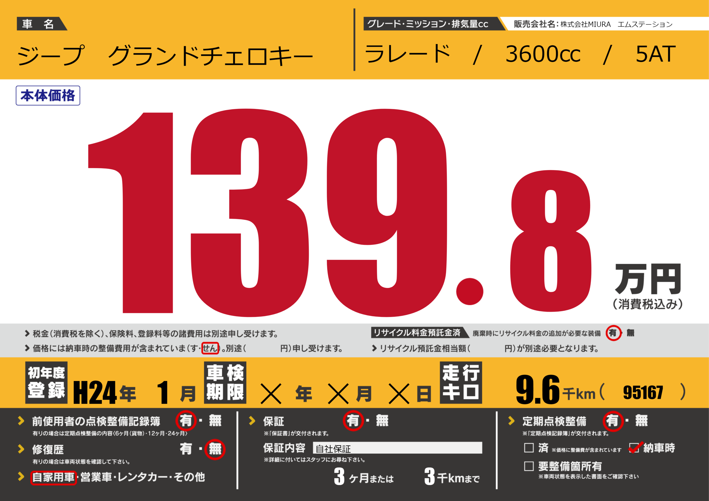 保証付き 保証内容(自社保証) 3ヶ月または(3)千kmまで |