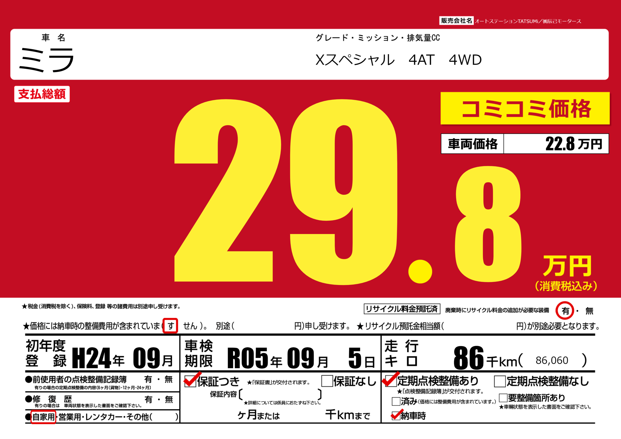 | 走行キロ | 8.6万km | 初年度登録 | H24年09月 |
