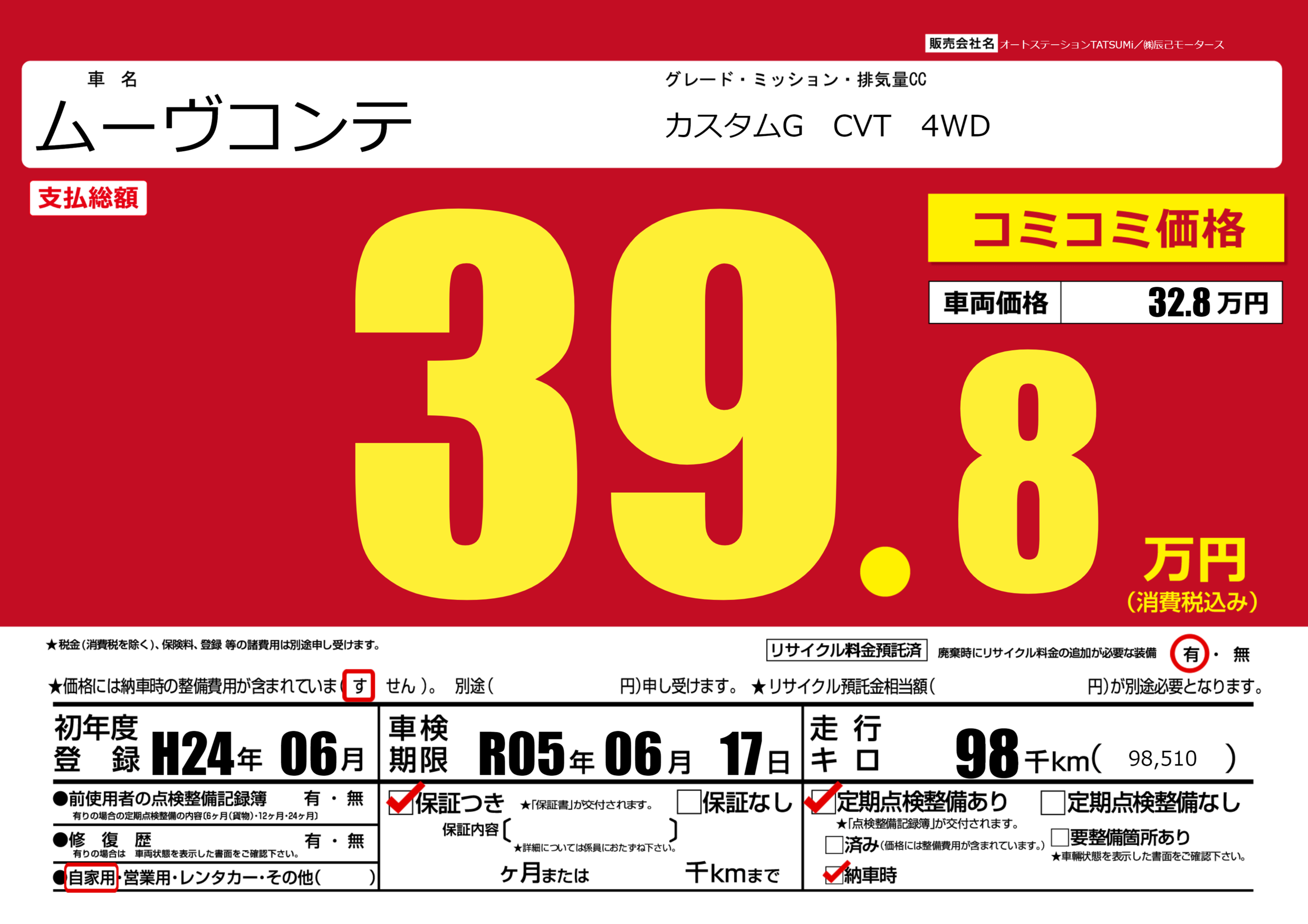 | 走行キロ | 9.8万km | 初年度登録 | H24年06月 |