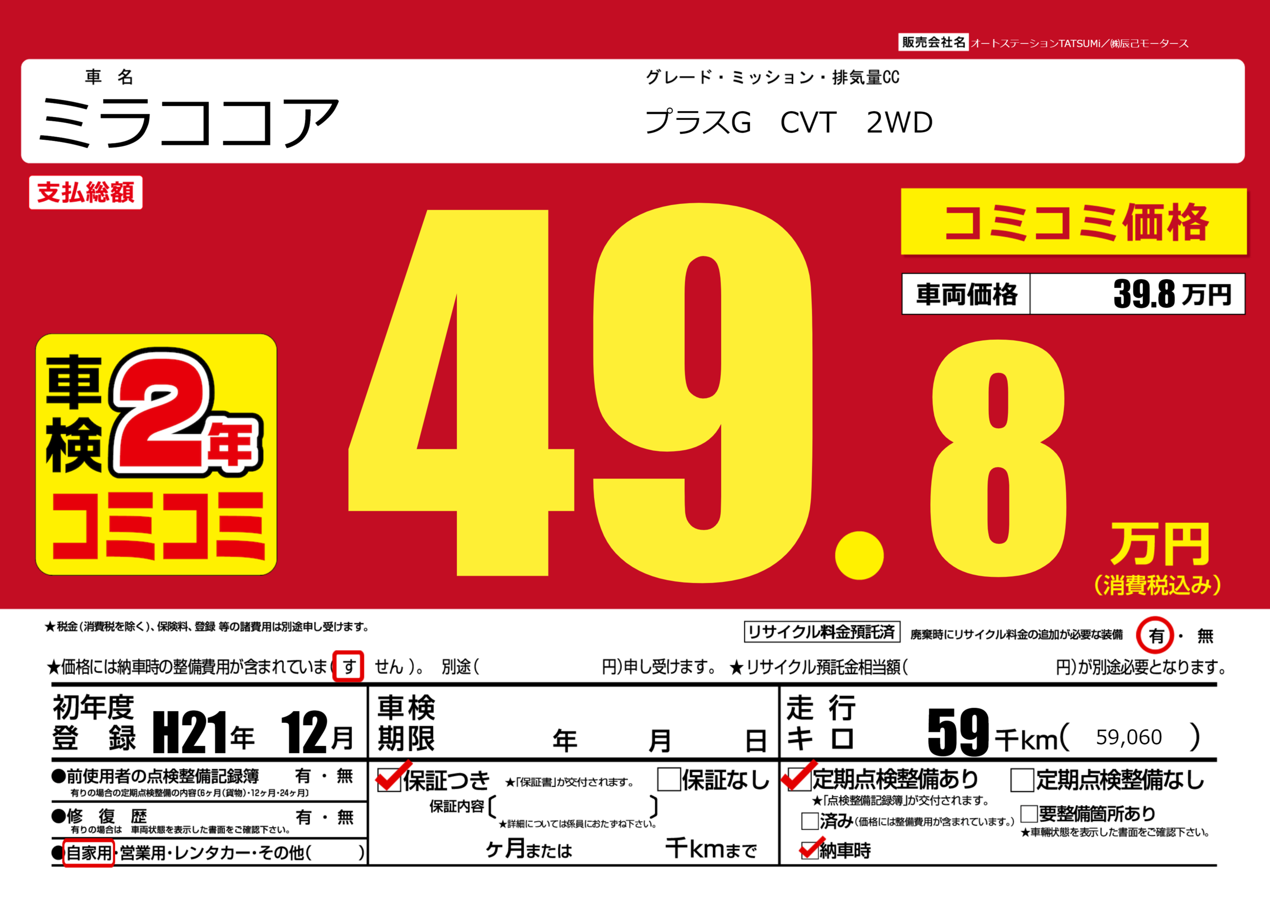 | 車名 | ミラココア | グレード ミッション 排気量 |