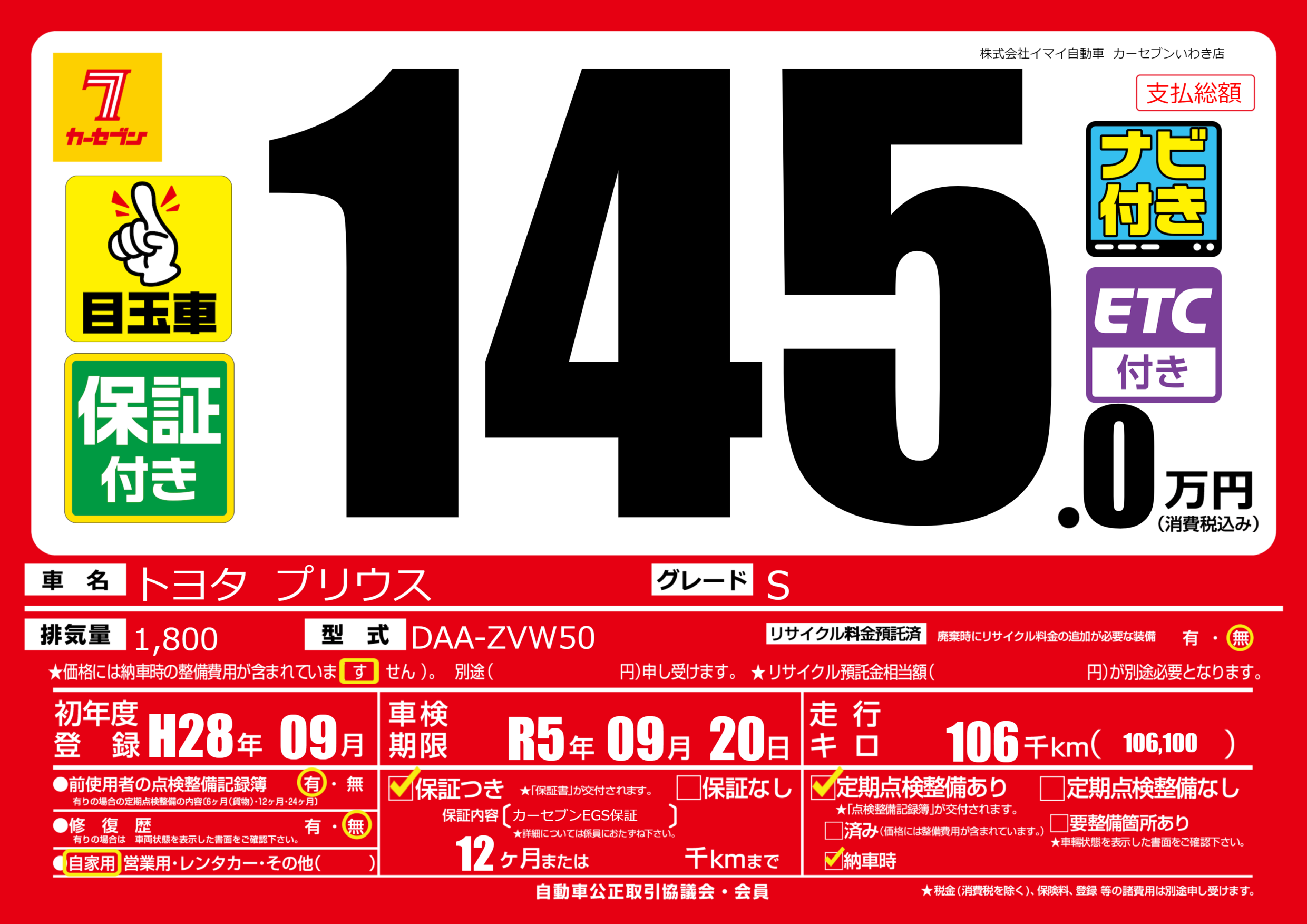 | 車名 | トヨタ プリウス | グレード ミッション 排気量 |