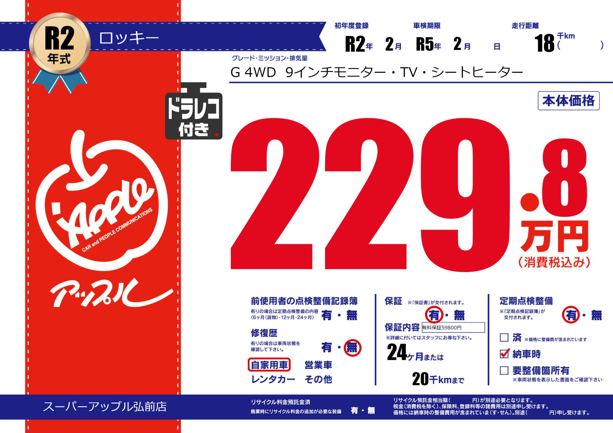 | 走行キロ | 1.8万km | 初年度登録 | R2年2月 |