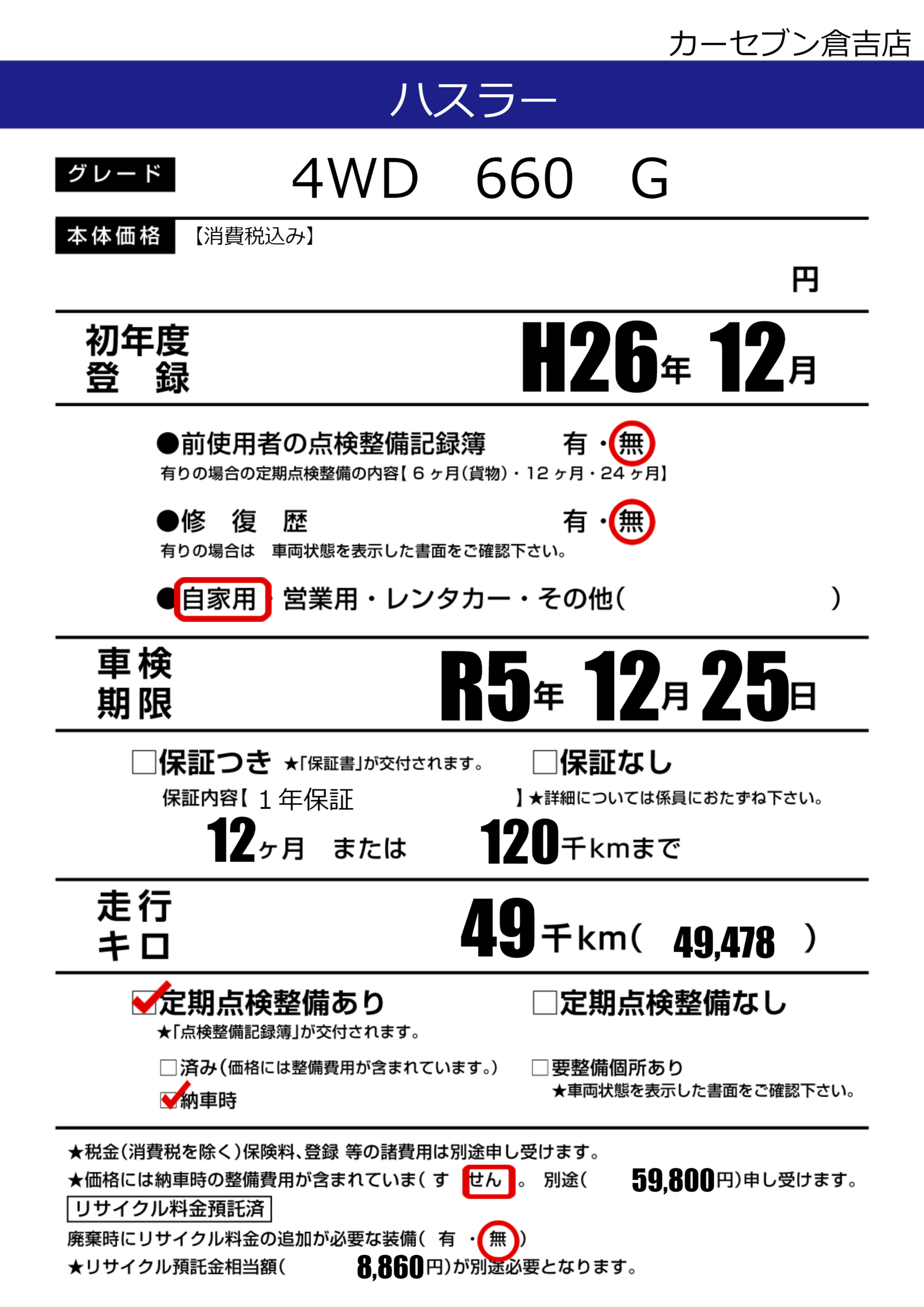 | 走行キロ | 4.9万km | 初年度登録 | H26年12月 |