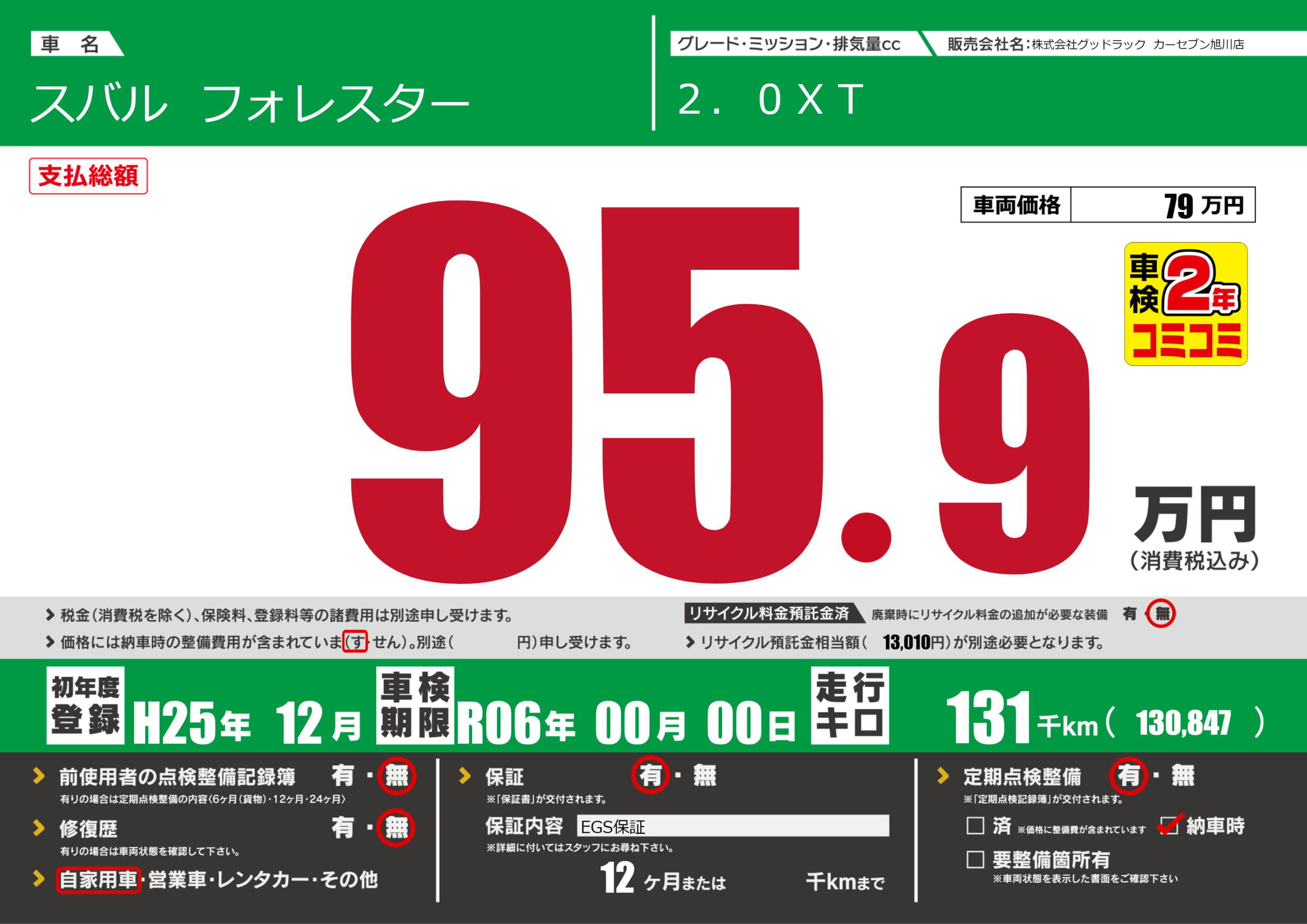 | 車名 | スバル フォレスター | グレード ミッション 排気量 |