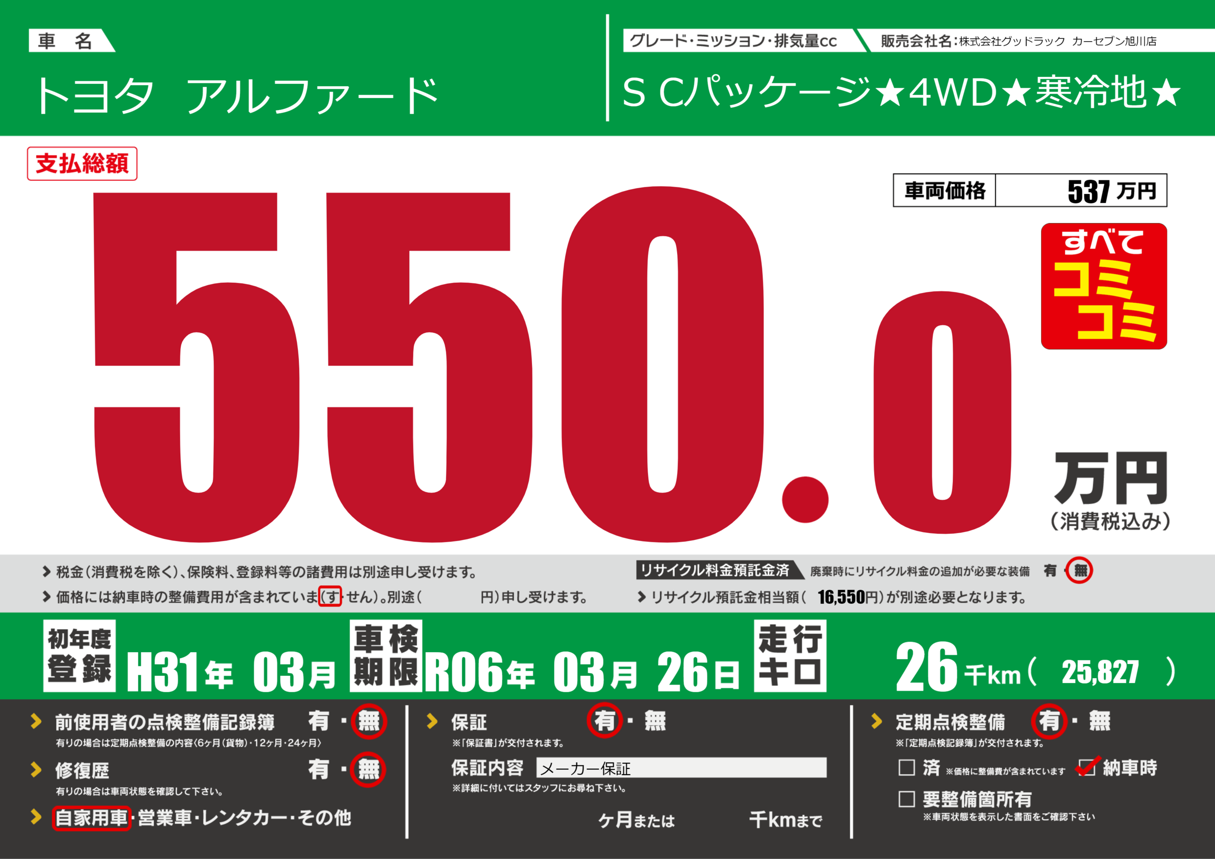 | 走行キロ | 2.6万km | 初年度登録 | H31年03月 |