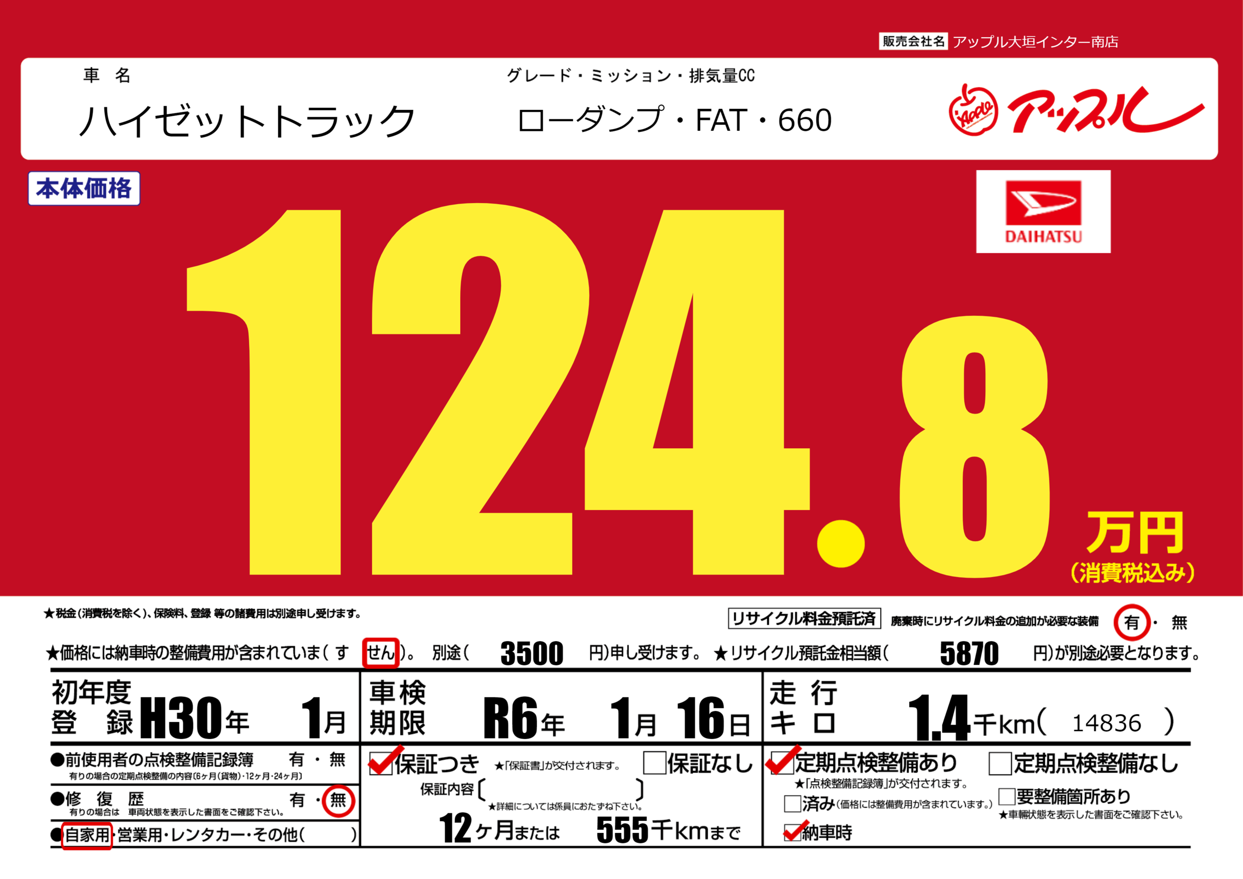| 定期点検整備 | 定期点検整備あり 納車時あり | ||
