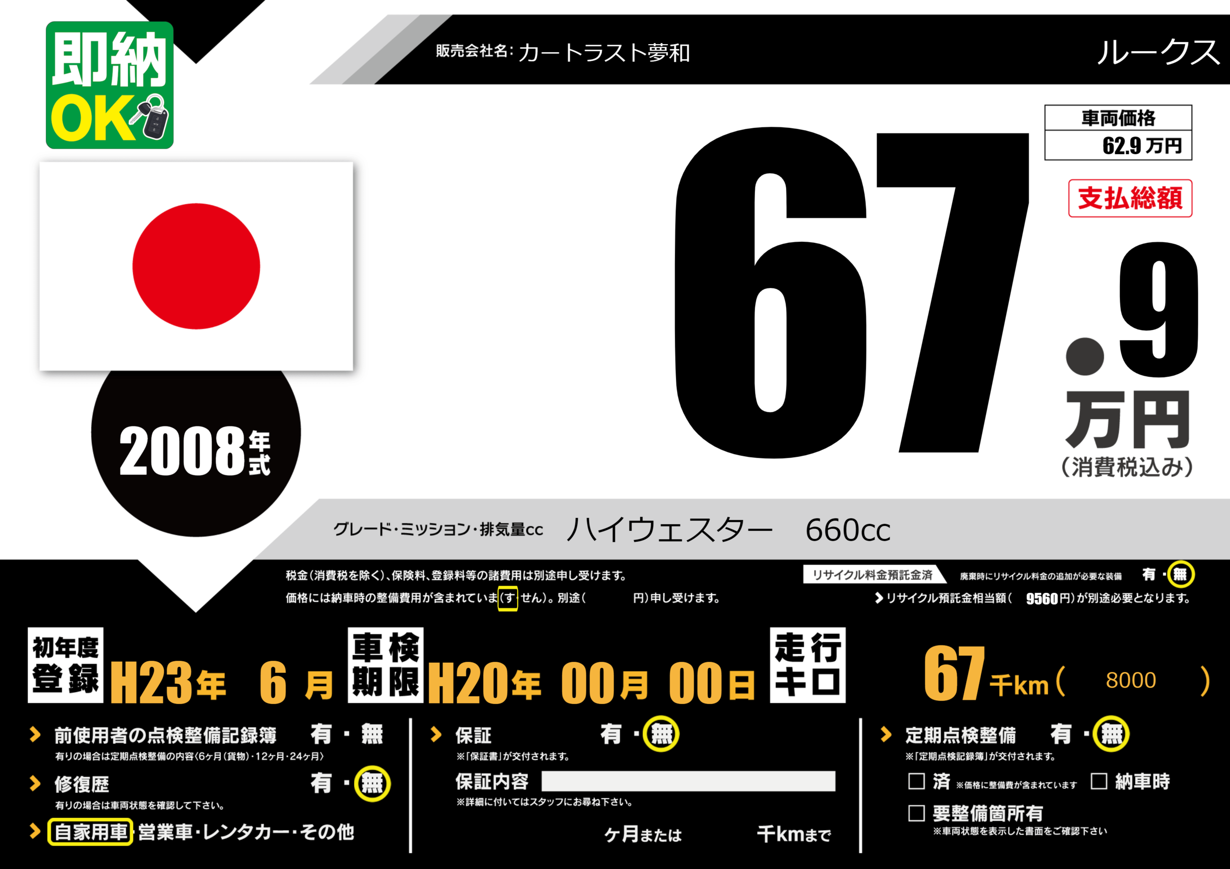 | 車検制限 | H20年 00月 00日 | ||
