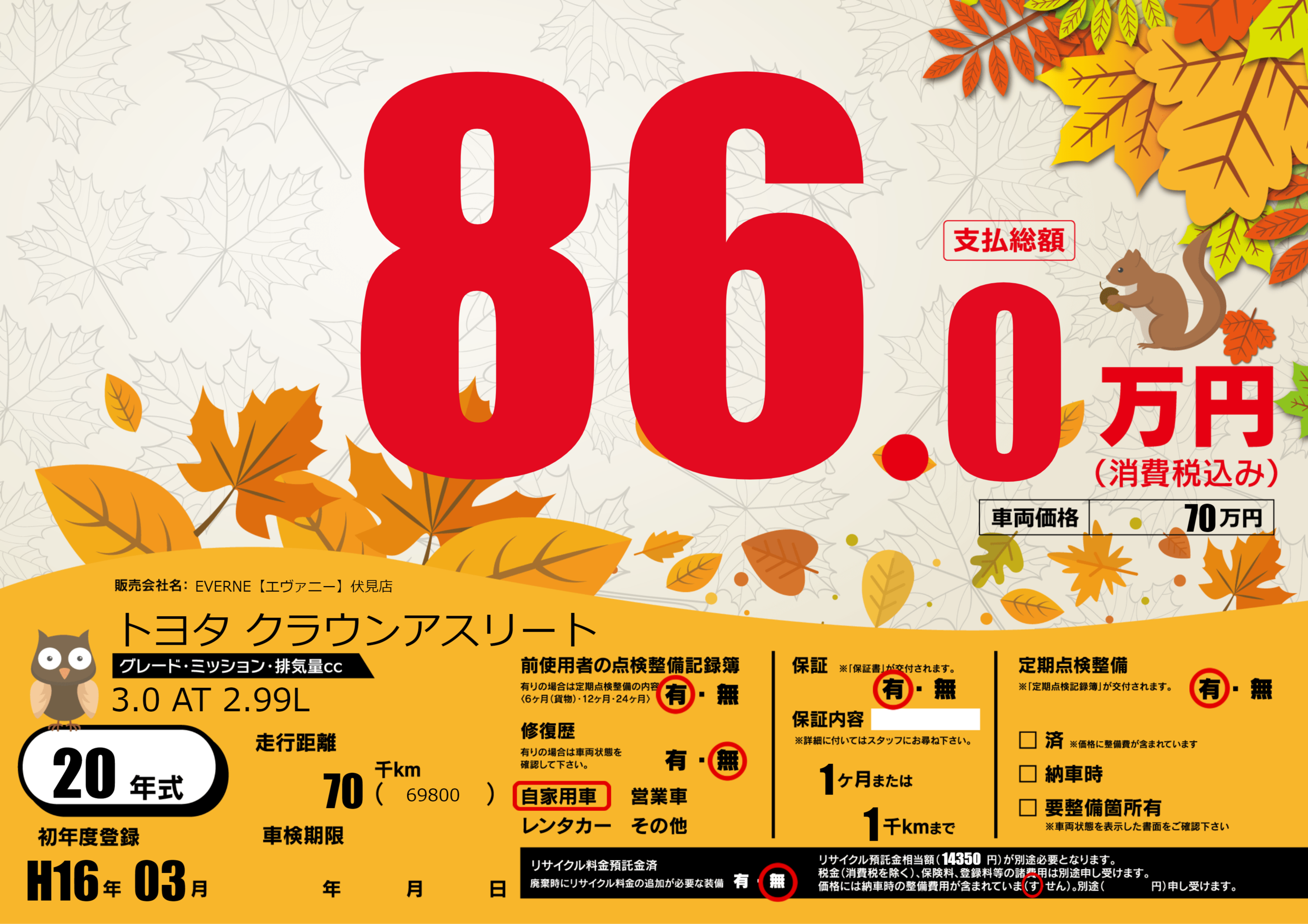 | 車名 | トヨタ クラウンアスリート | グレード ミッション 排気量 |