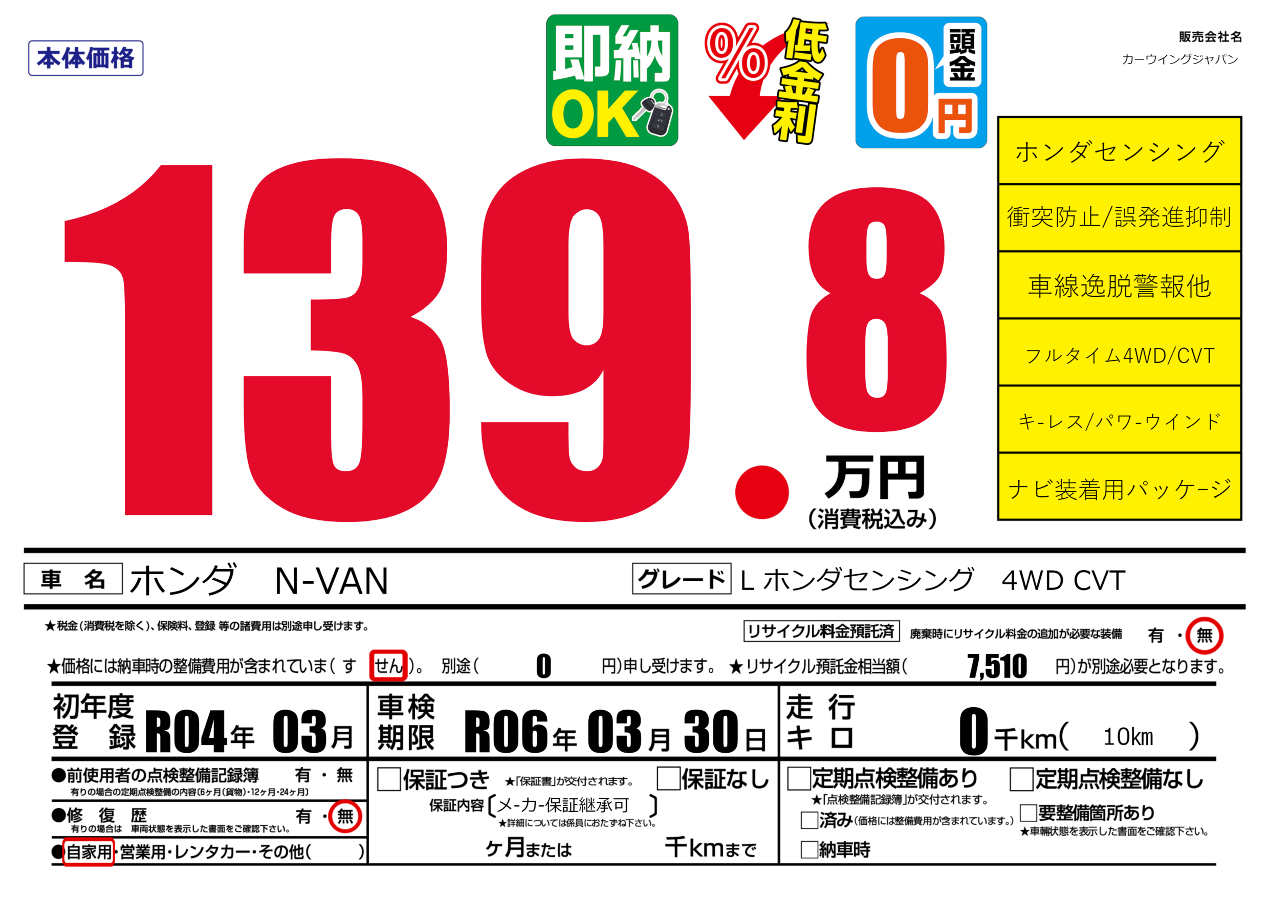| 車名 | ホンダ N-VAN | グレード ミッション 排気量 |