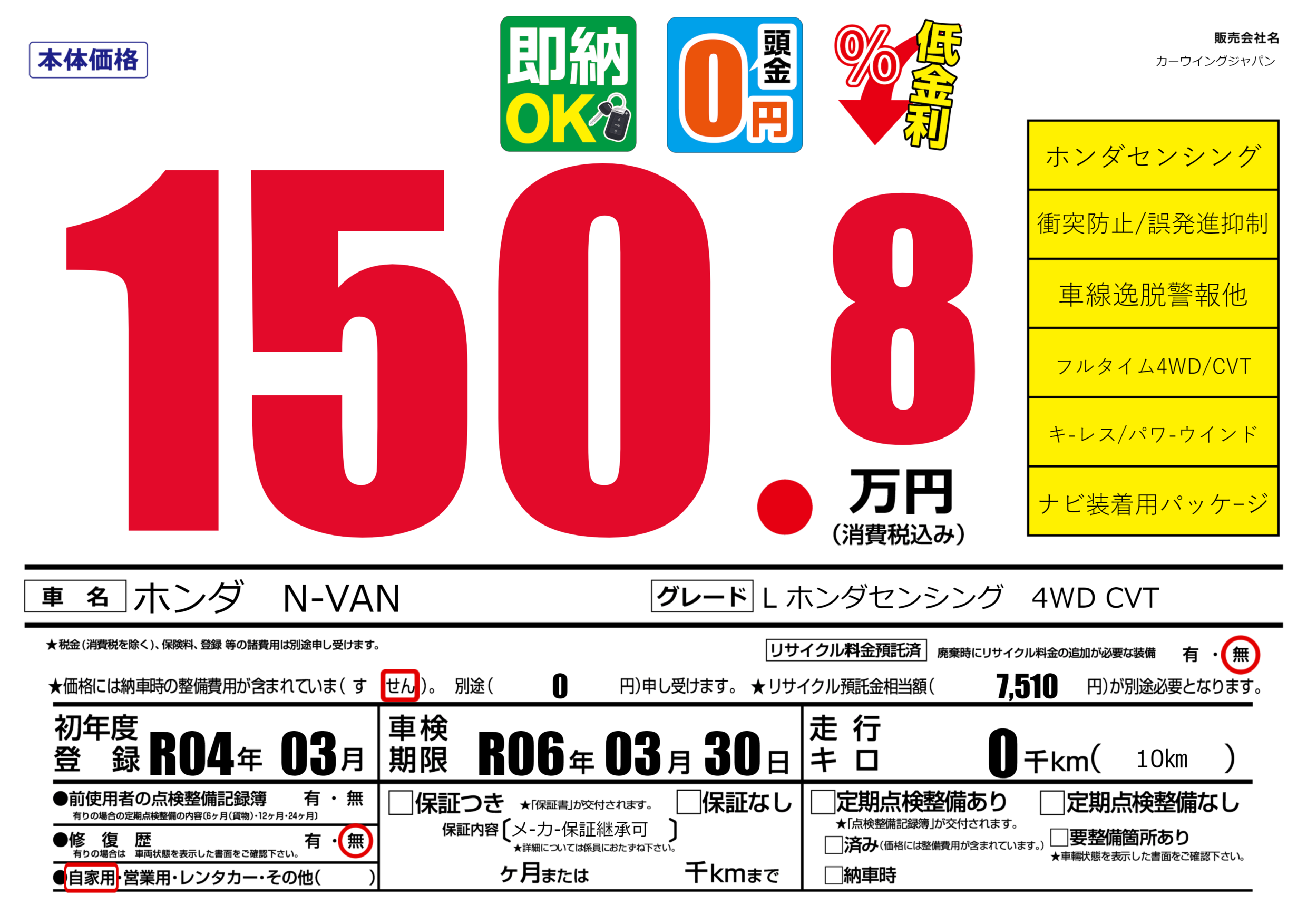 | 車名 | ホンダ N-VAN | グレード ミッション 排気量 |