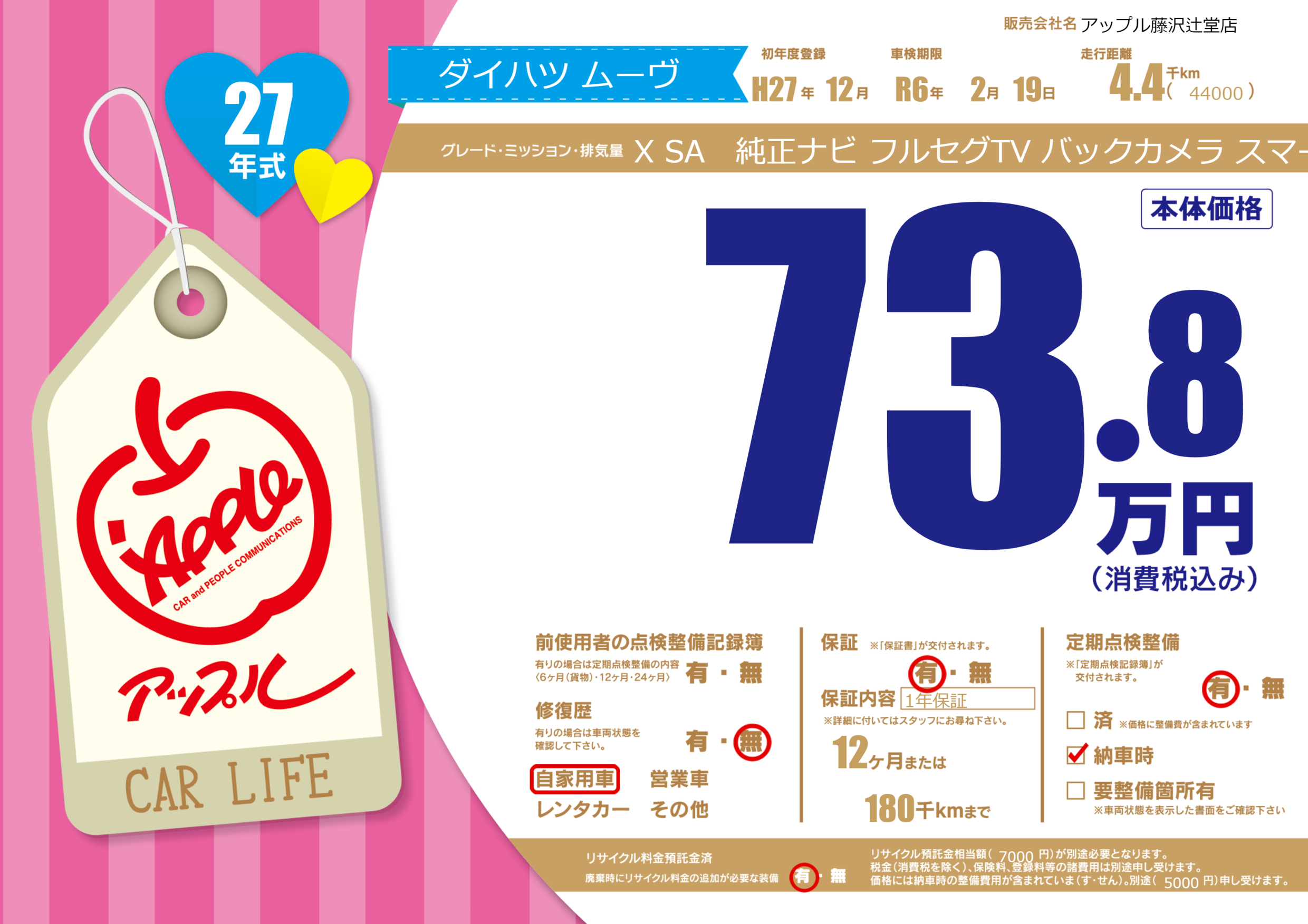 | 走行キロ | 0.4万km | 初年度登録 | H27年12月 |