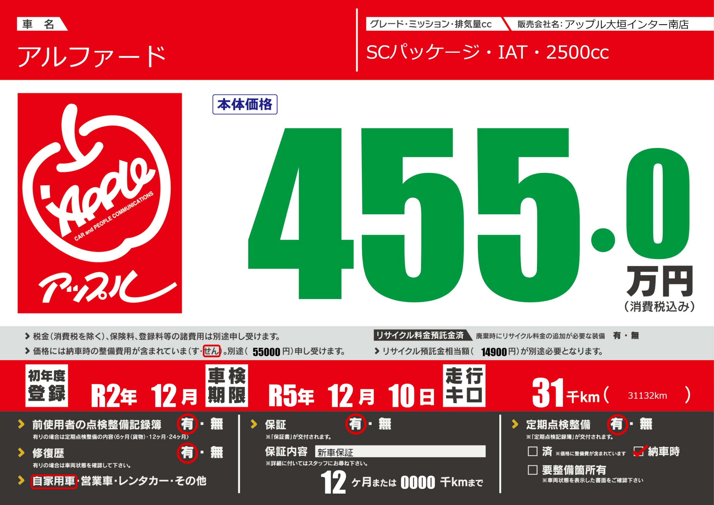 保証付き 保証内容(新車保証) 12ヶ月または(0000)千kmまで |