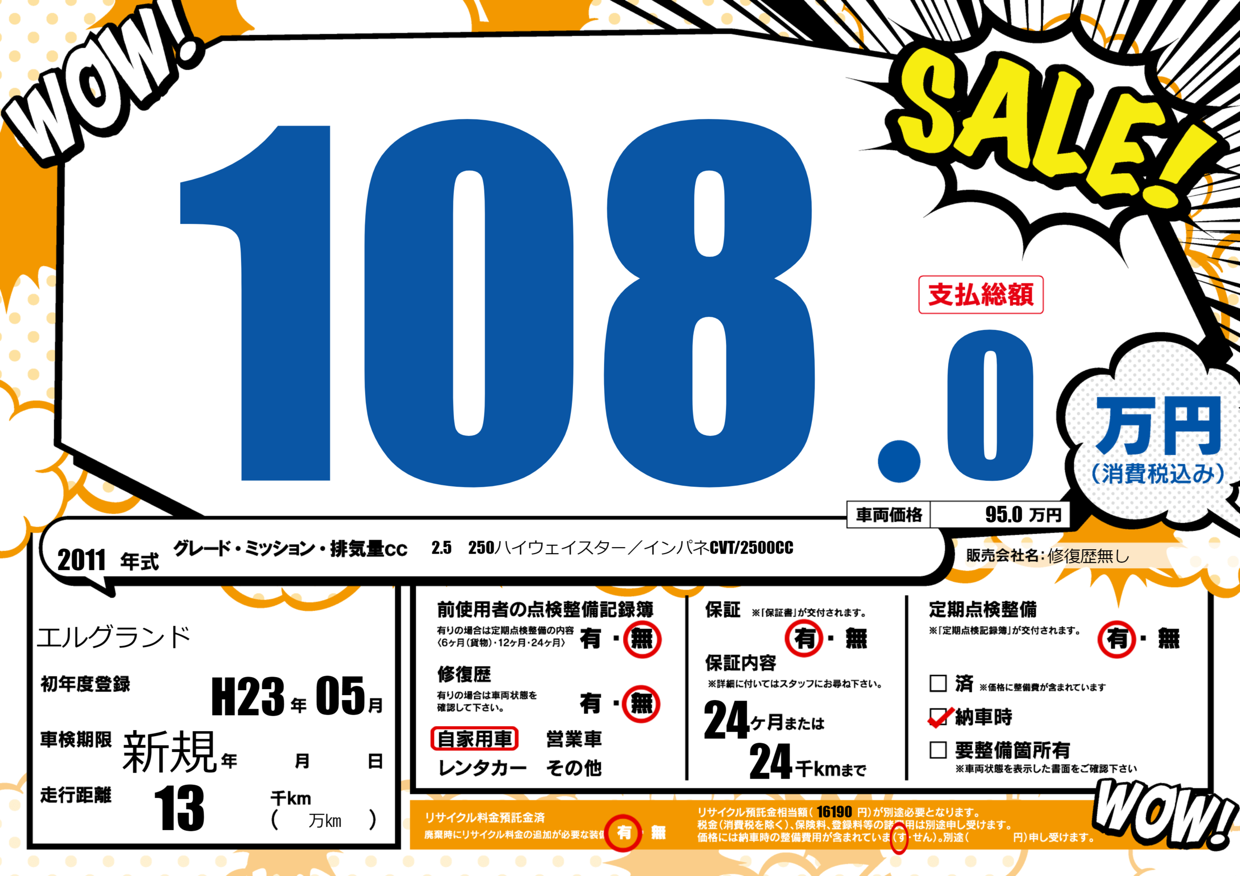 | 車名 | エルグランド | グレード ミッション 排気量 |