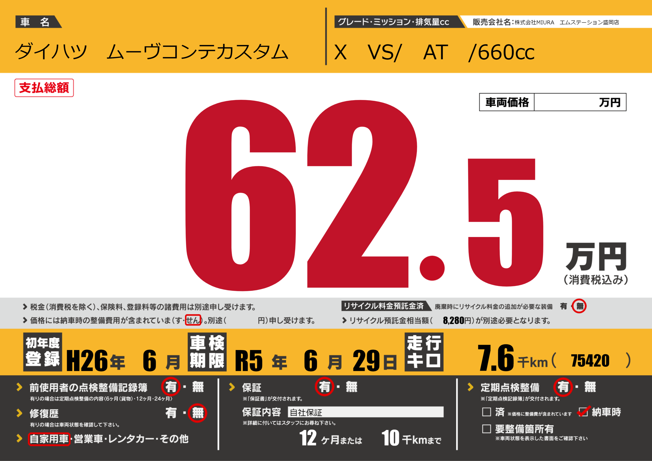 | 車名 | ダイハツ ムーヴコンテカスタム | グレード ミッション 排気量 |