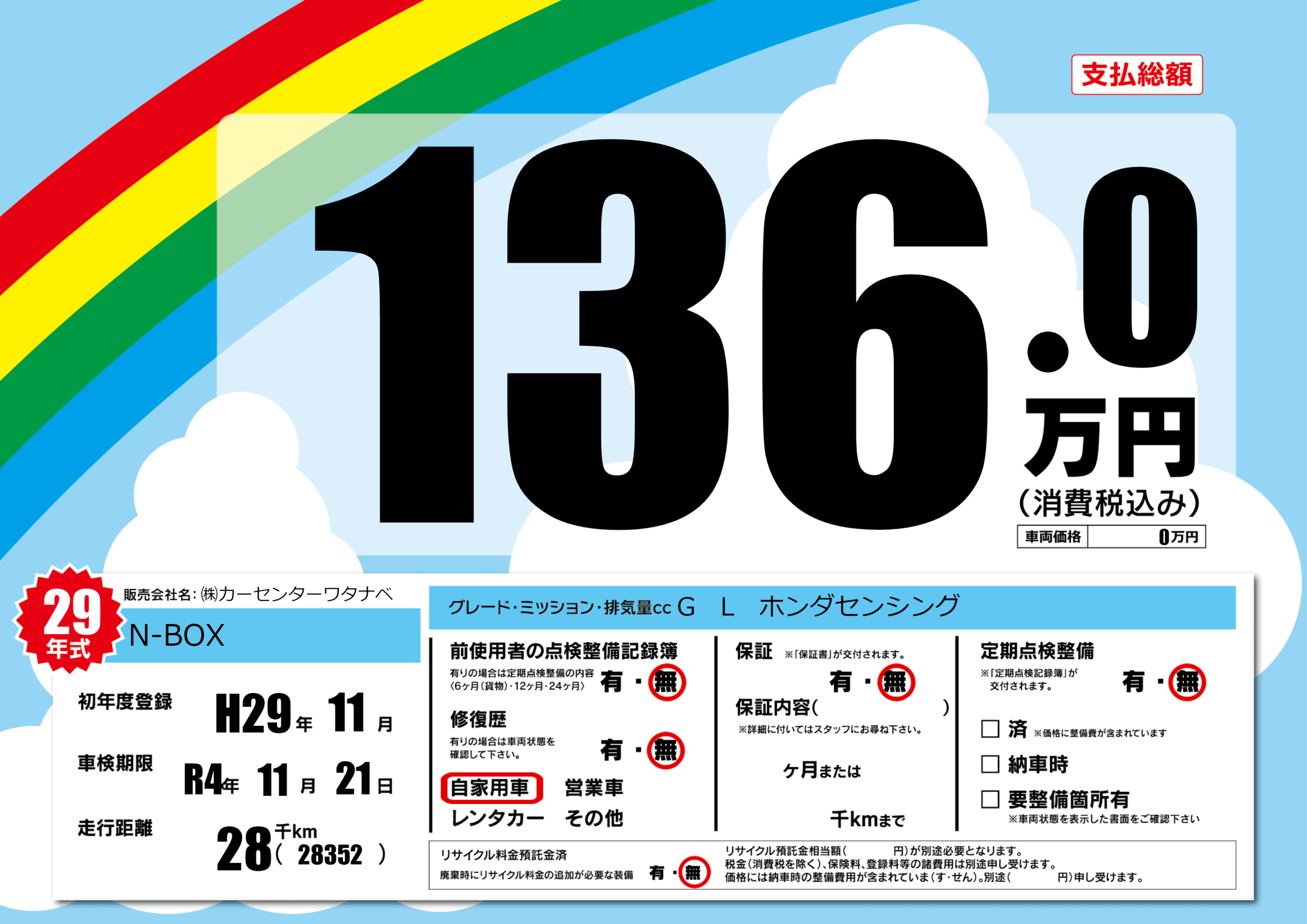 | 走行キロ | 2.8万km | 初年度登録 | H29年11月 |