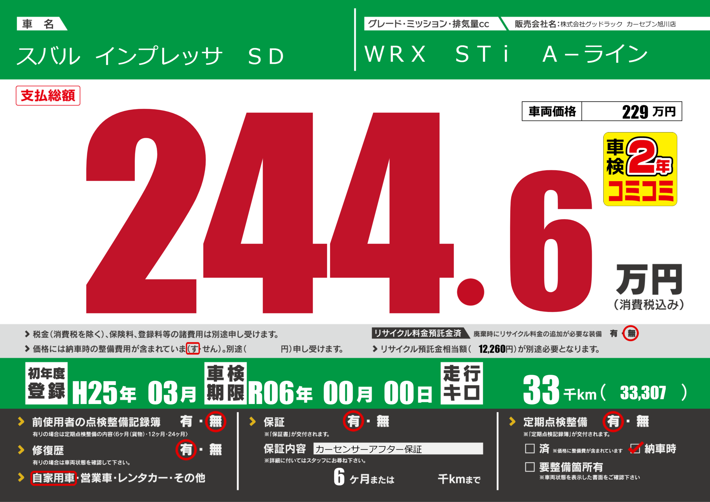 | 車名 | スバル インプレッサ SD | グレード ミッション 排気量 |
