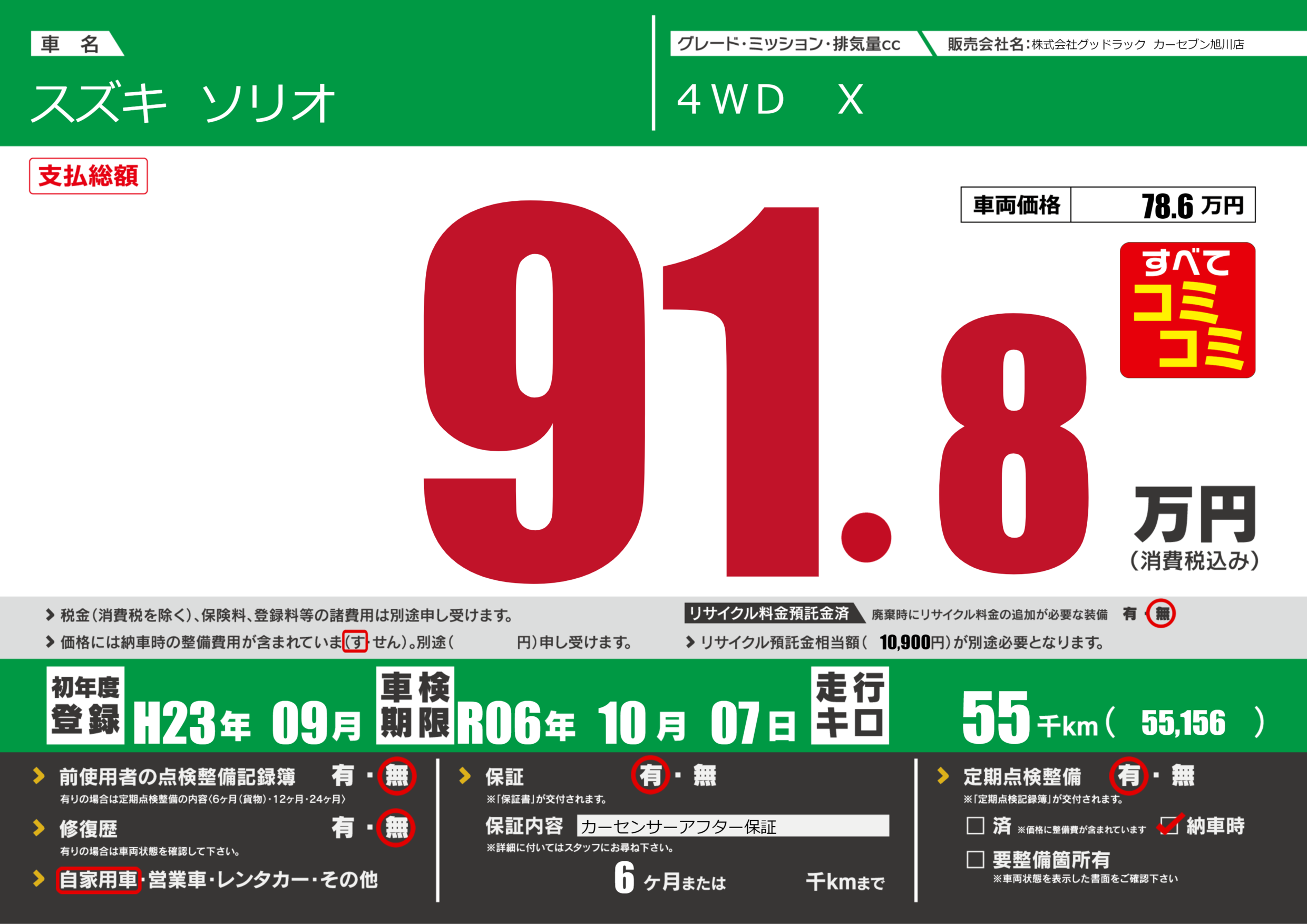 | 走行キロ | 5.5万km | 初年度登録 | H23年09月 |