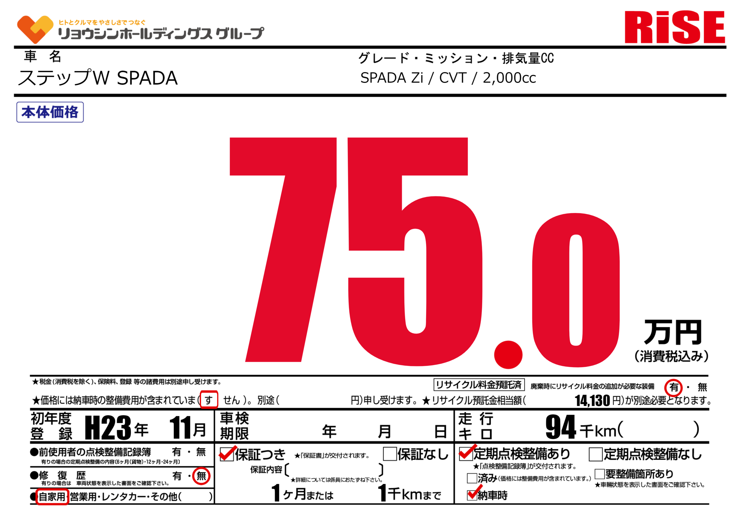 | 車名 | ステップW SPADA | グレード ミッション 排気量 |