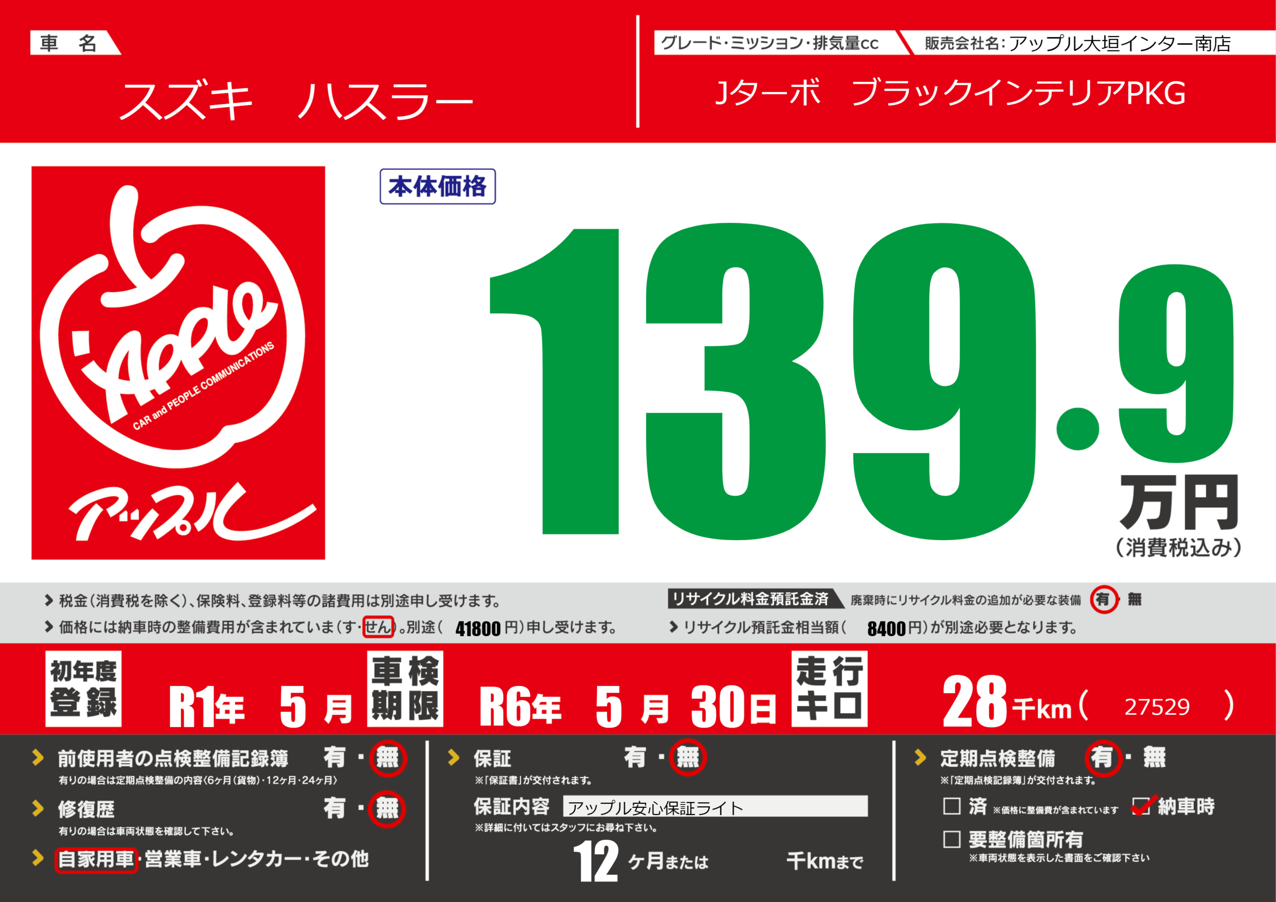 | 車名 | スズキ ハスラー | グレード ミッション 排気量 |