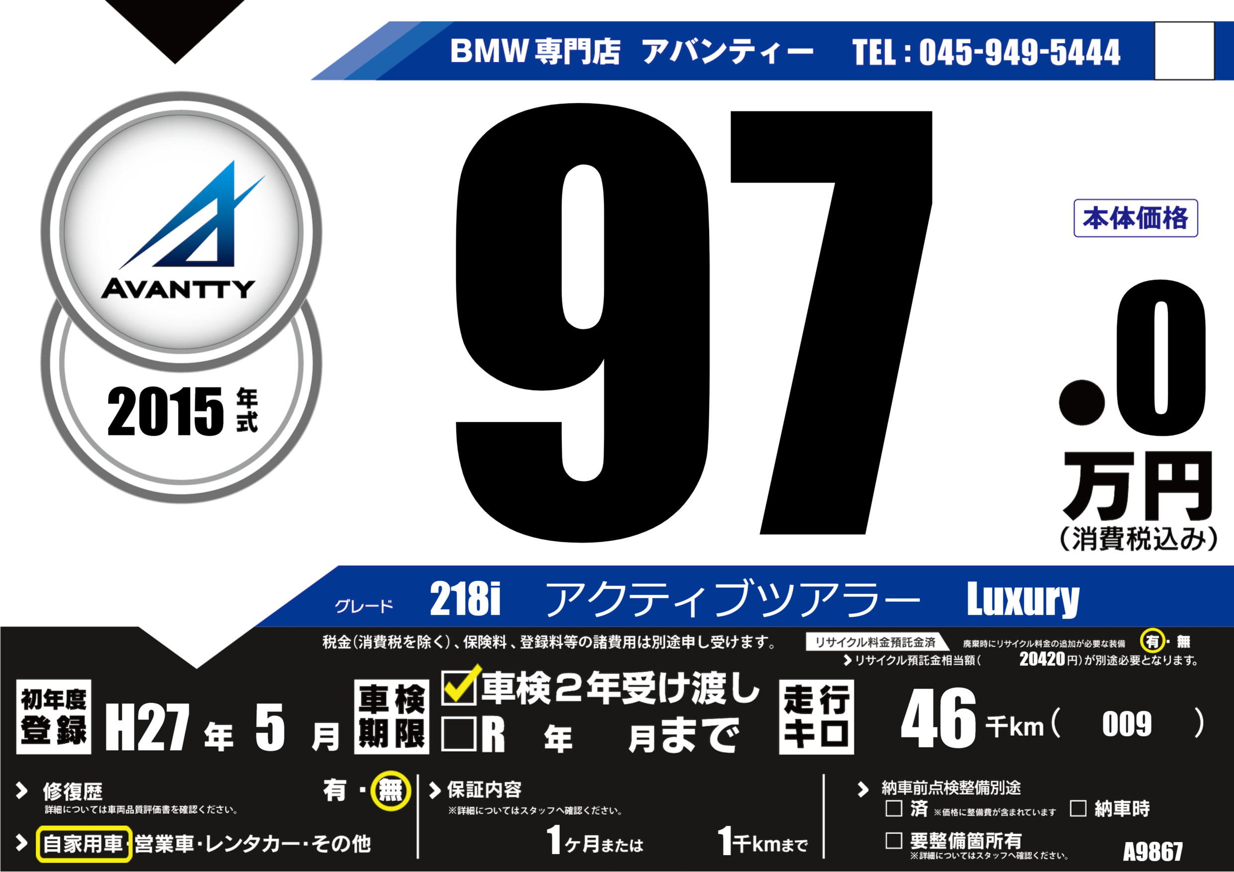| 走行キロ | 4.6万km | 初年度登録 | H27年5月 |