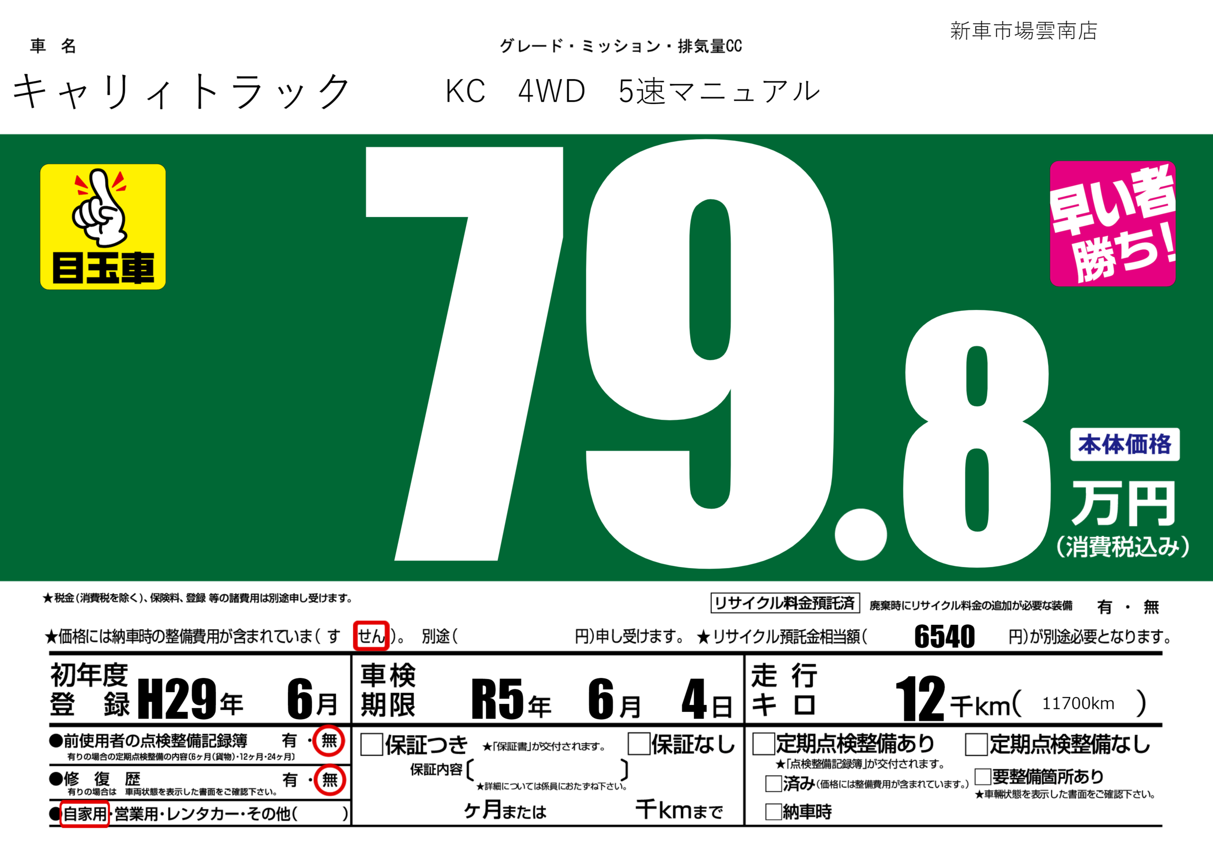 | 車名 | キャリィトラック | グレード ミッション 排気量 |