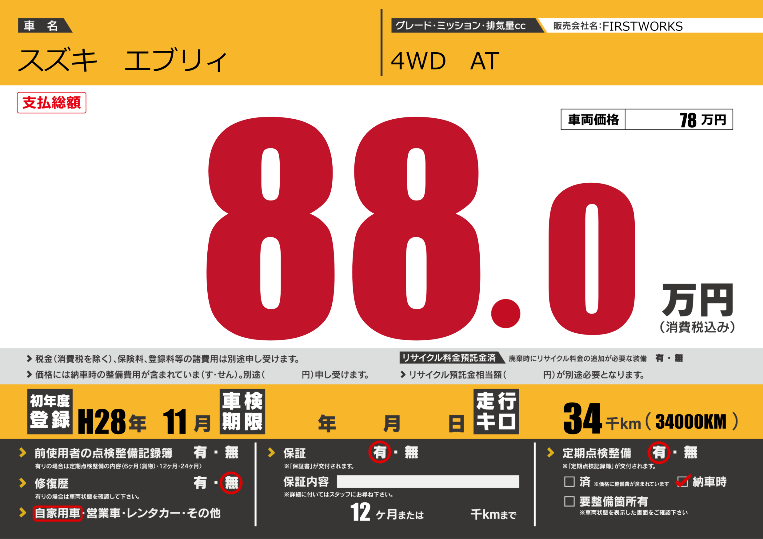 保証なし 保証内容(---) 12ヶ月または()千kmまで |