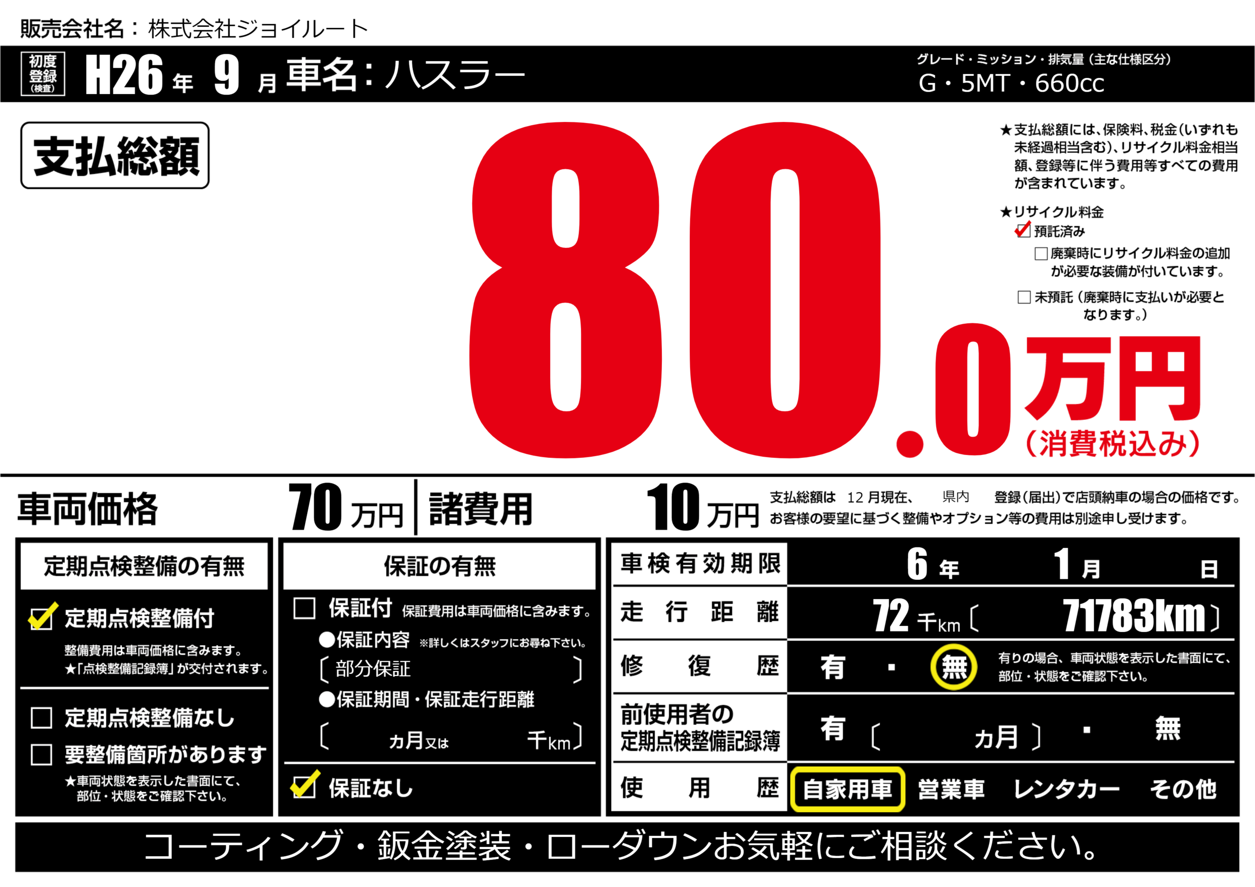 | 車名 | ハスラー | グレード ミッション 排気量 |