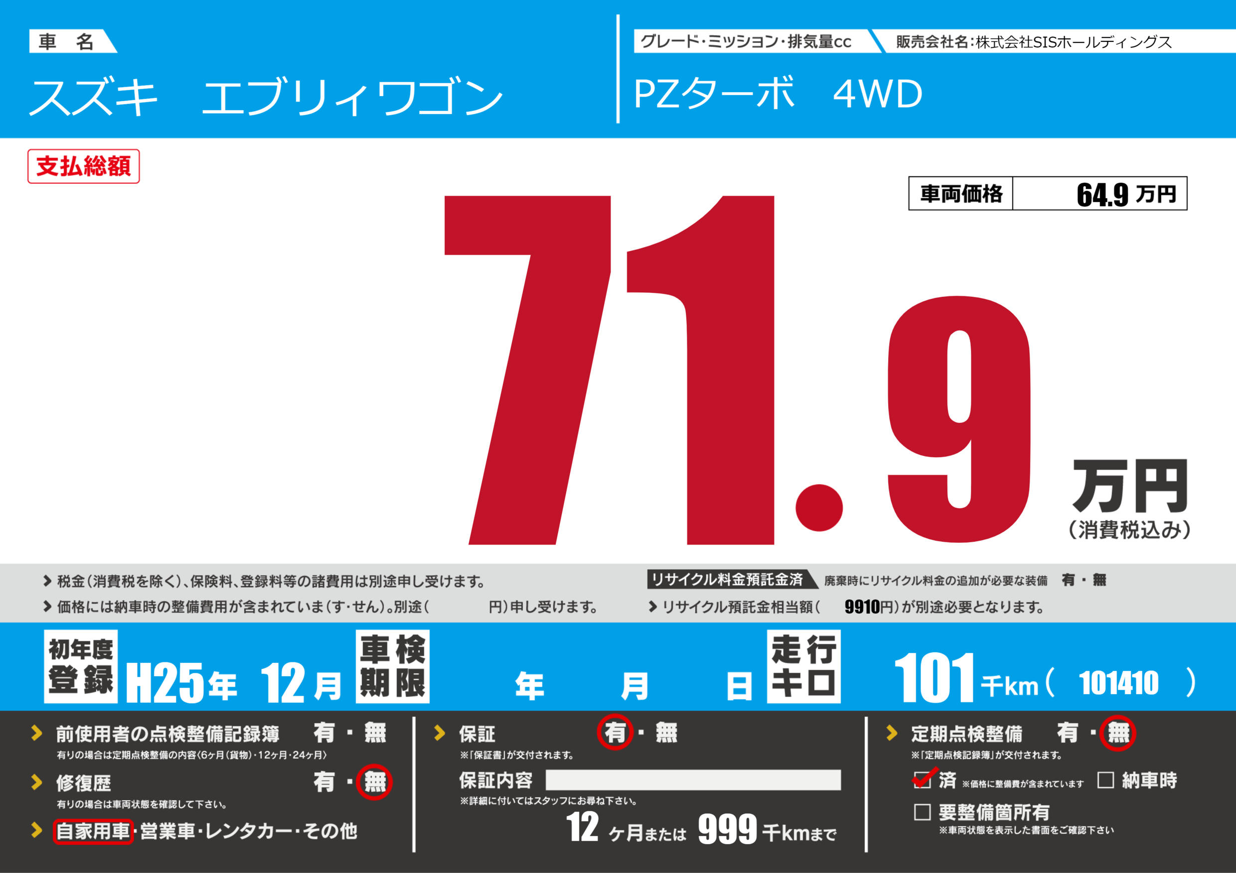 保証付き 保証内容(---) 12ヶ月または(999)千kmまで |