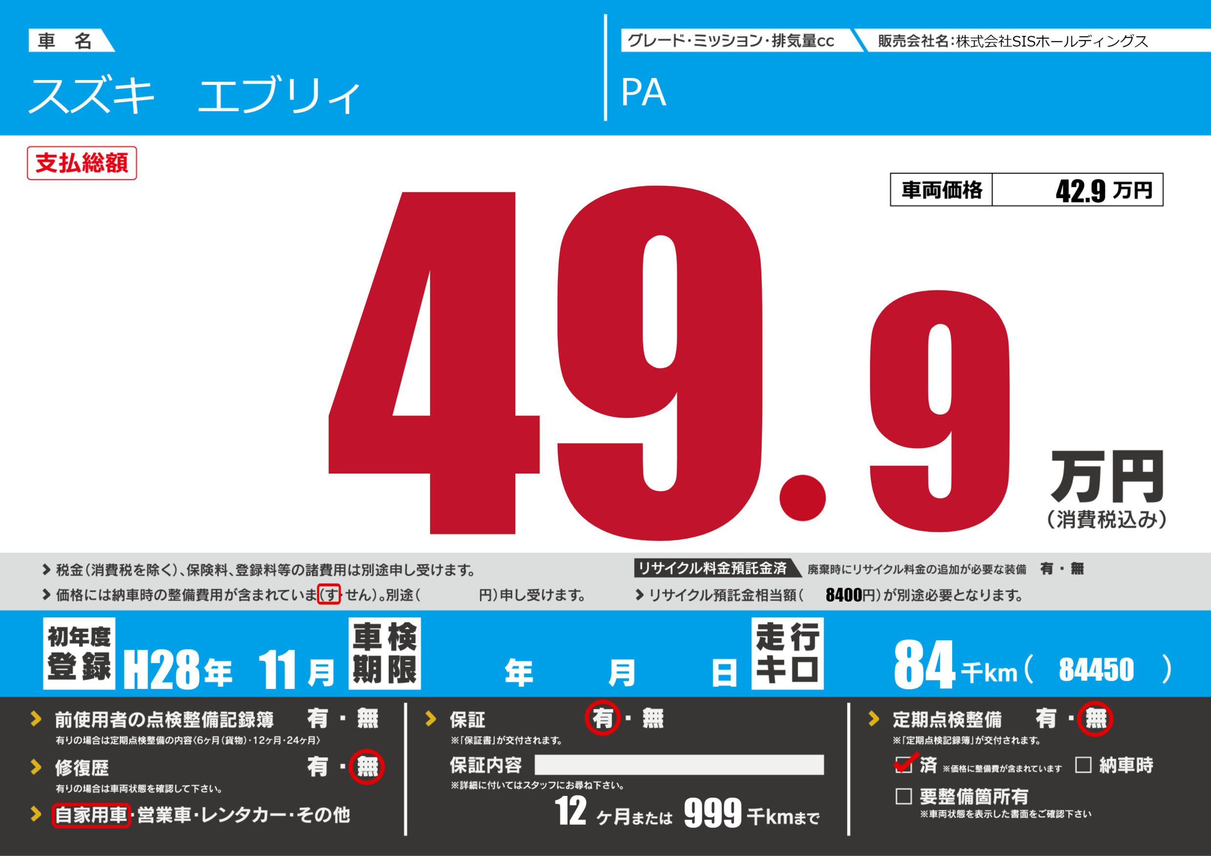| 定期点検整備 | 定期点検整備なし 定期点検整備済み | ||