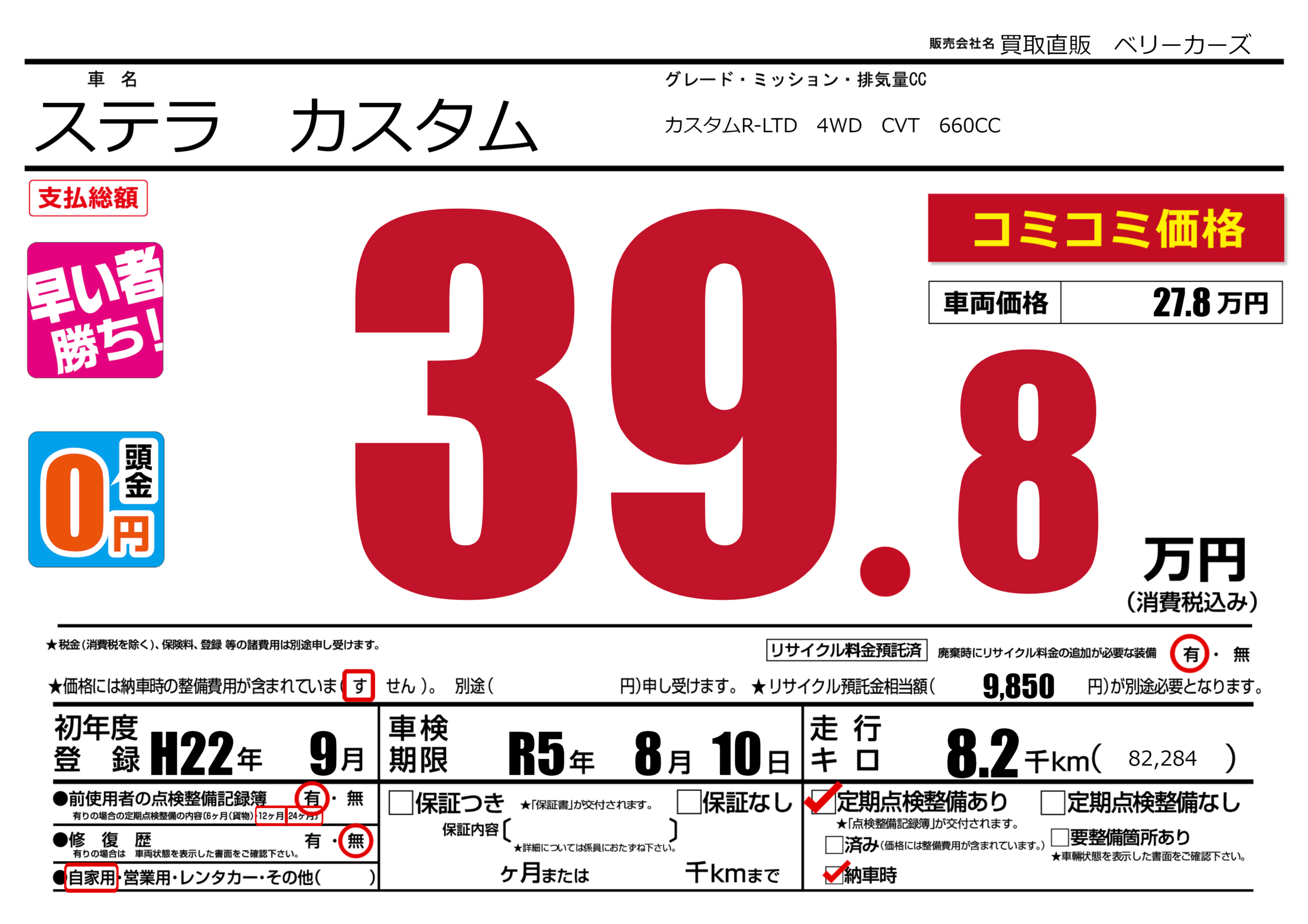 | 車名 | ステラ カスタム | グレード ミッション 排気量 |