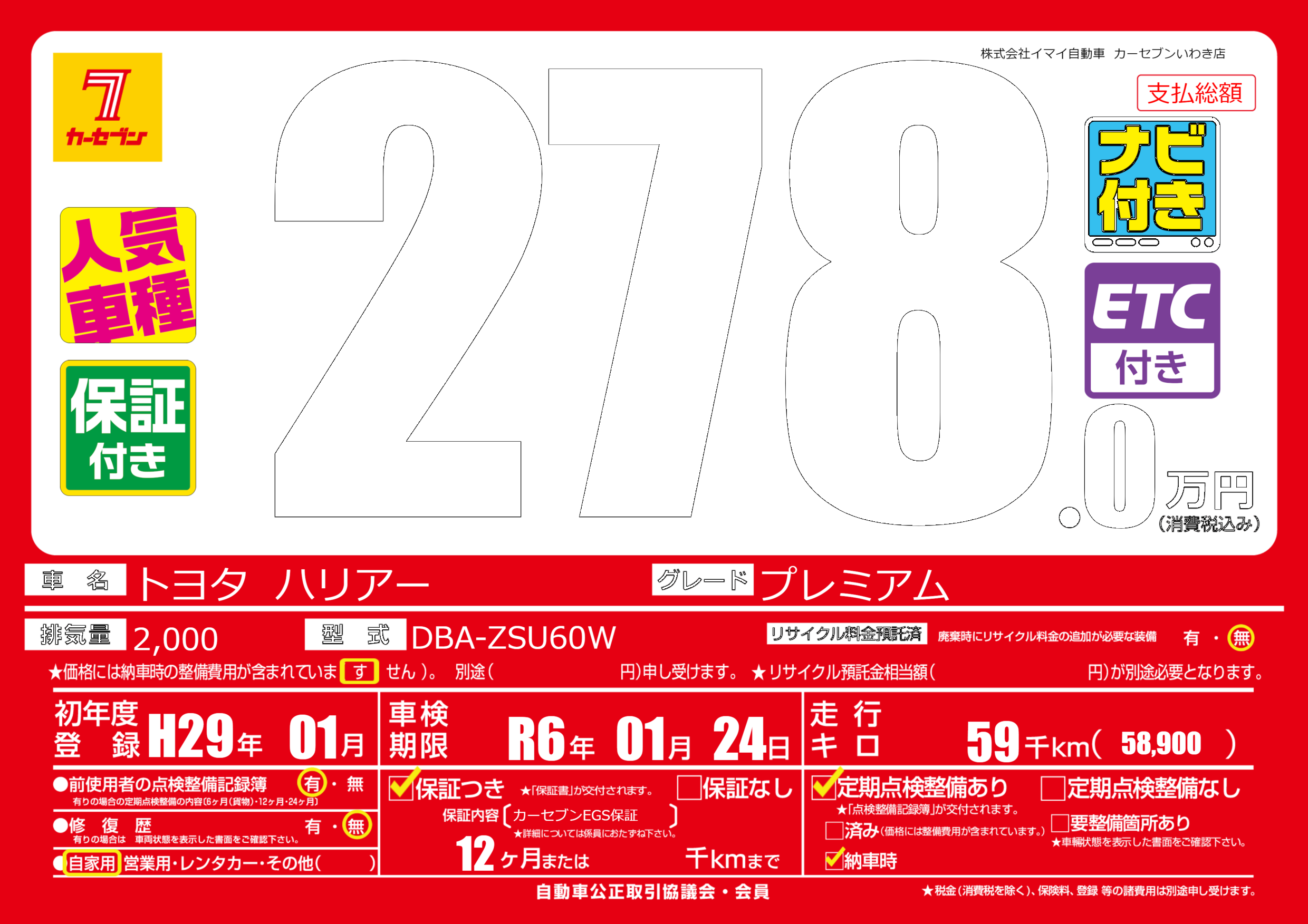 | 車名 | トヨタ ハリアー | グレード ミッション 排気量 |