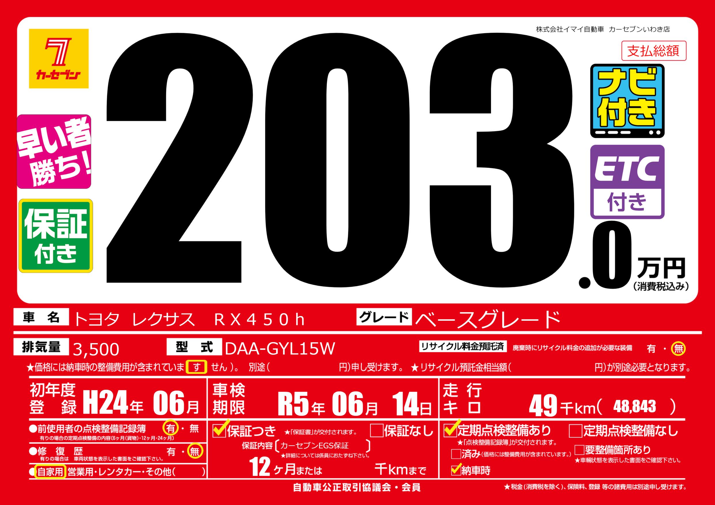| 車名 | トヨタ レクサス RX450h | グレード ミッション 排気量 |