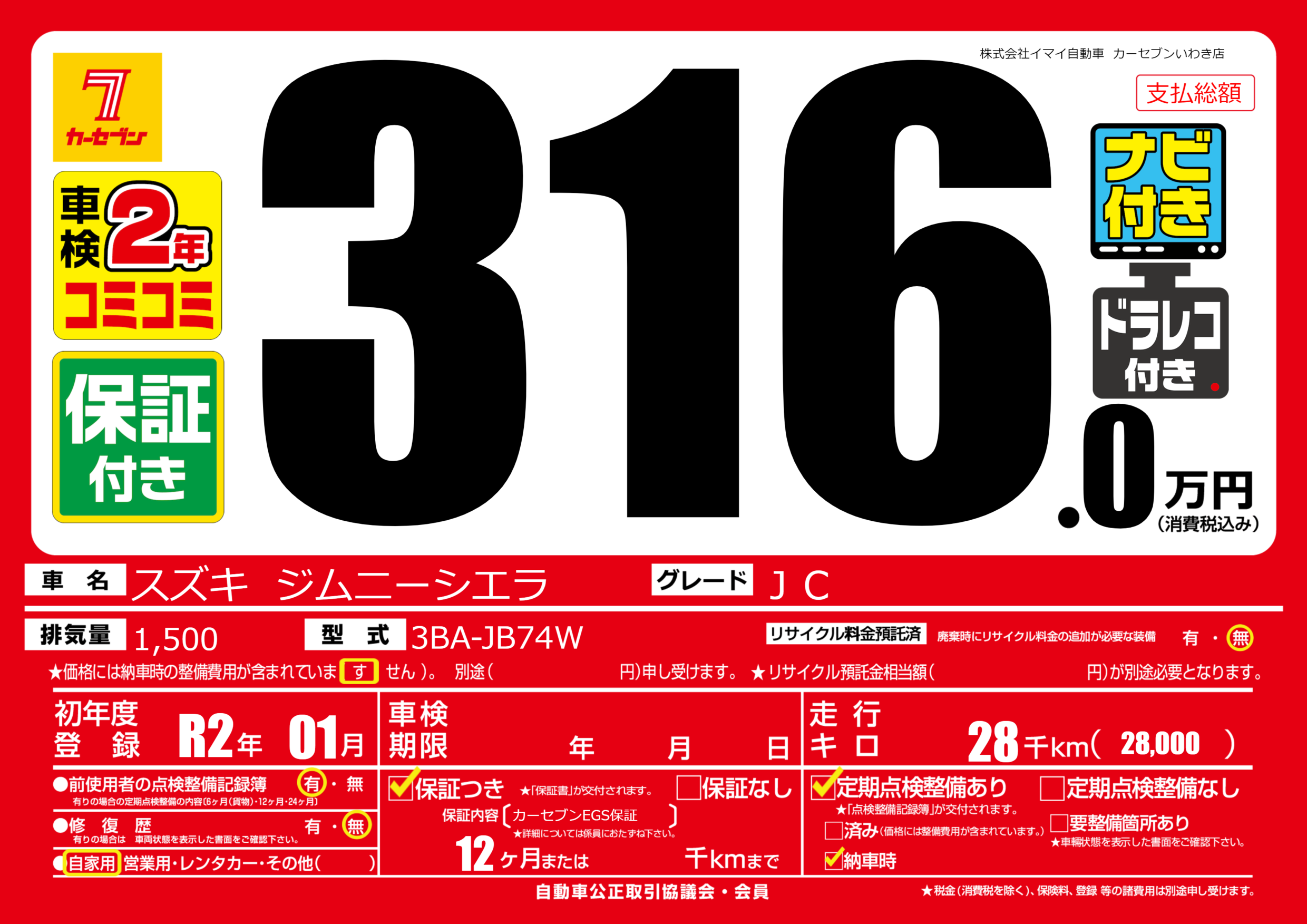 | 車名 | スズキ ジムニーシエラ | グレード ミッション 排気量 |