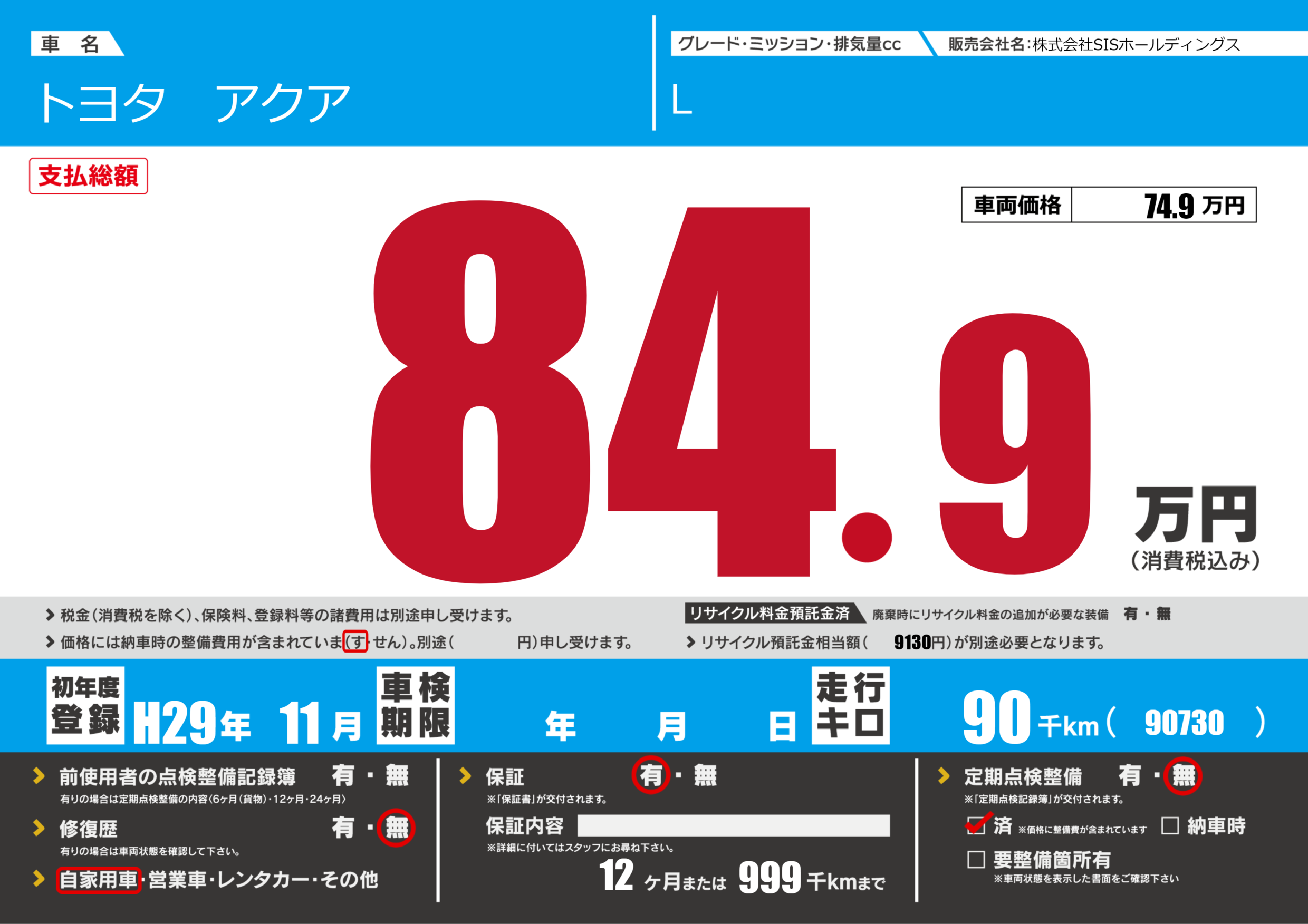 | 走行キロ | 9万km | 初年度登録 | H29年11月 |