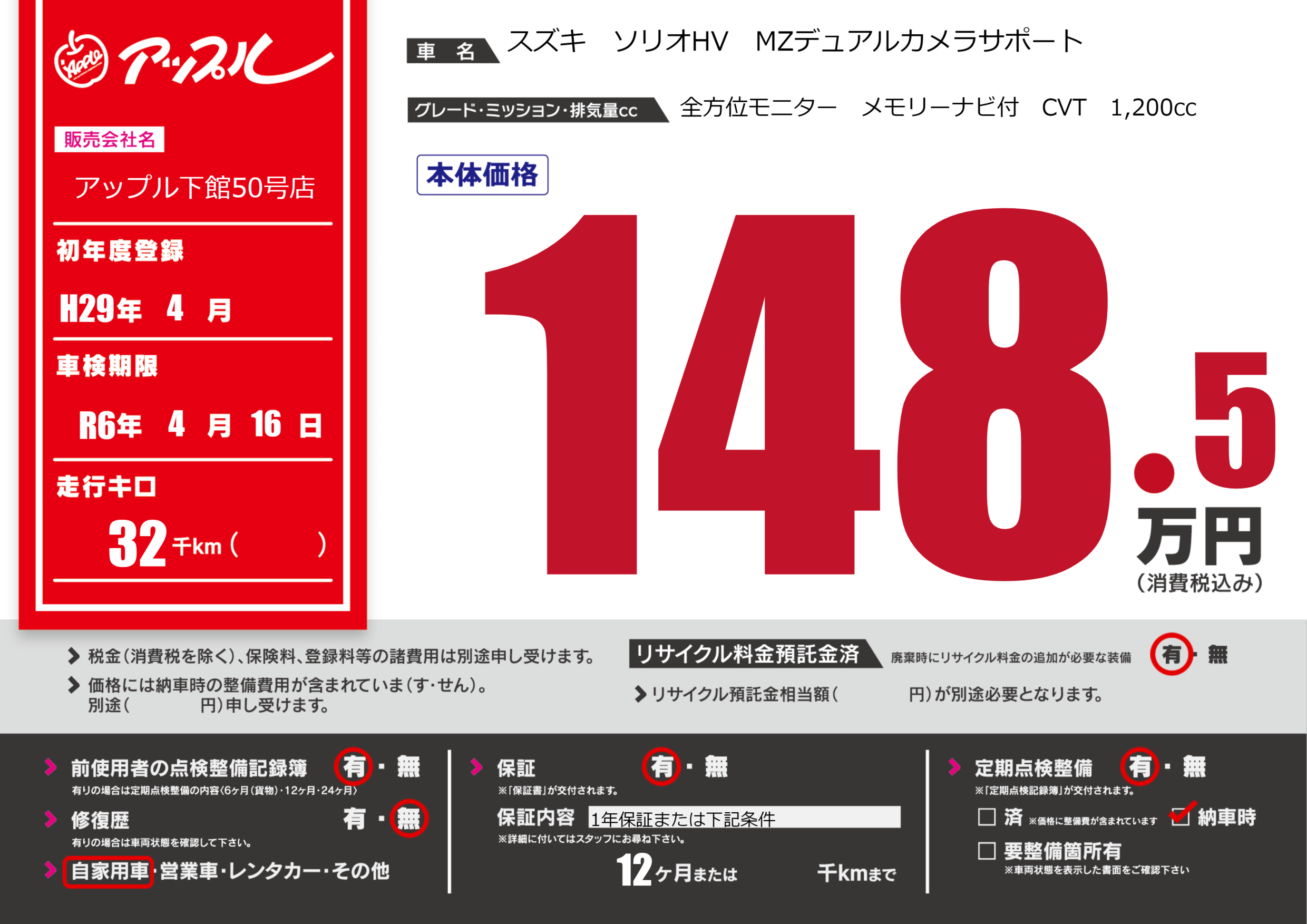 | 車名 | スズキ ソリオHV MZデュアルカメラサポート | グレード ミッション 排気量 |