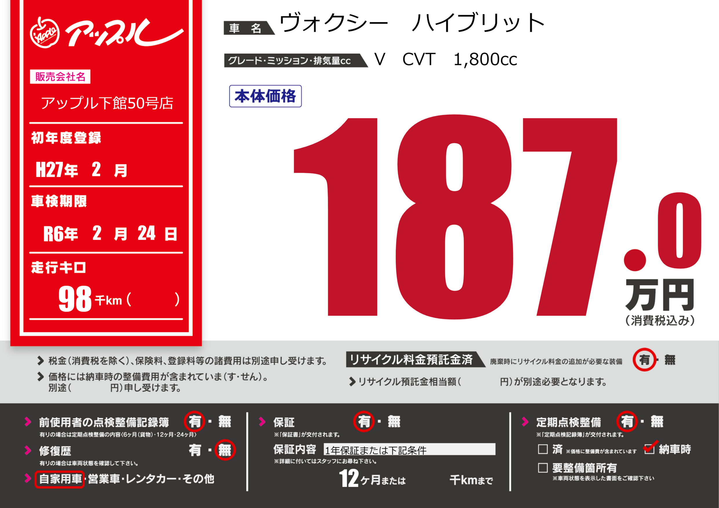 | 走行キロ | 9.8万km | 初年度登録 | H27年2月 |