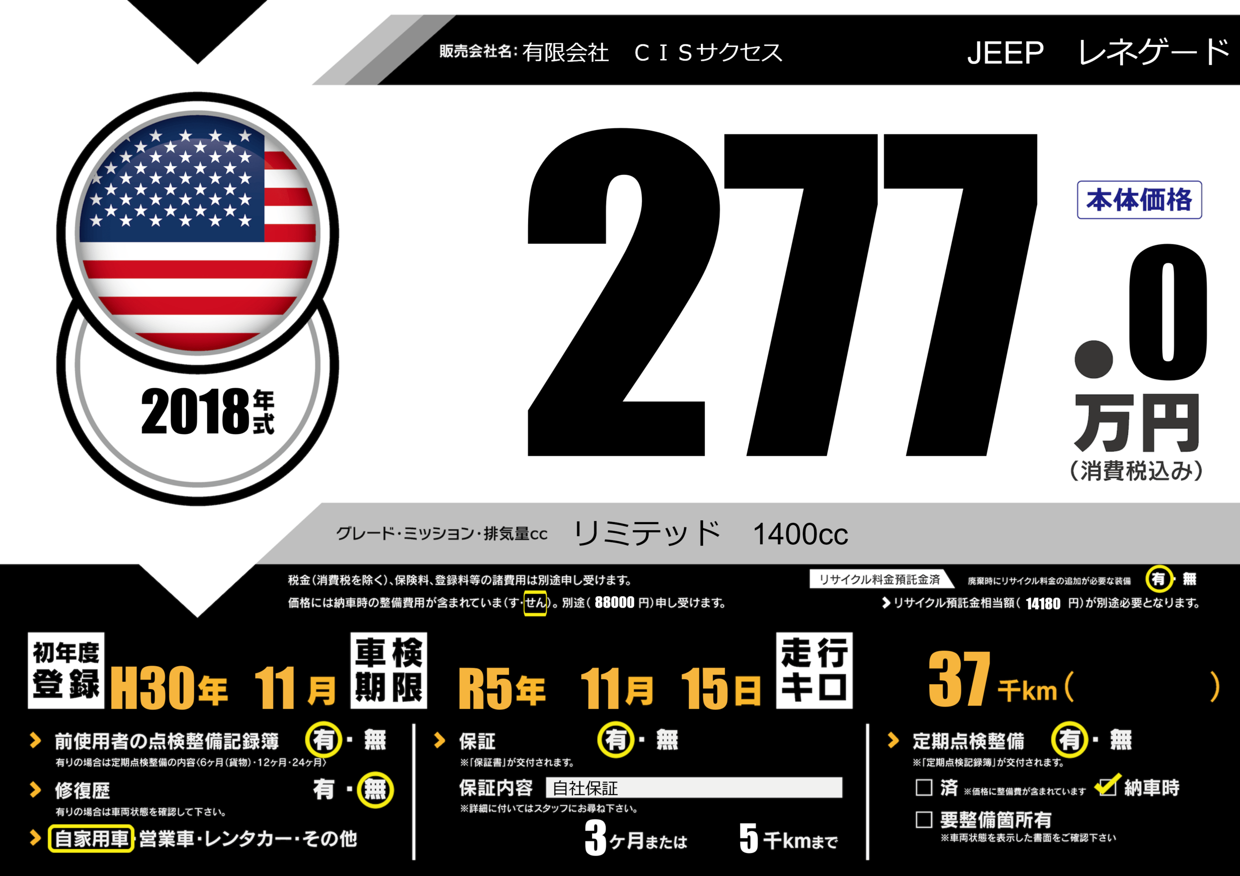 | 車名 | JEEP レネゲード | グレード ミッション 排気量 |